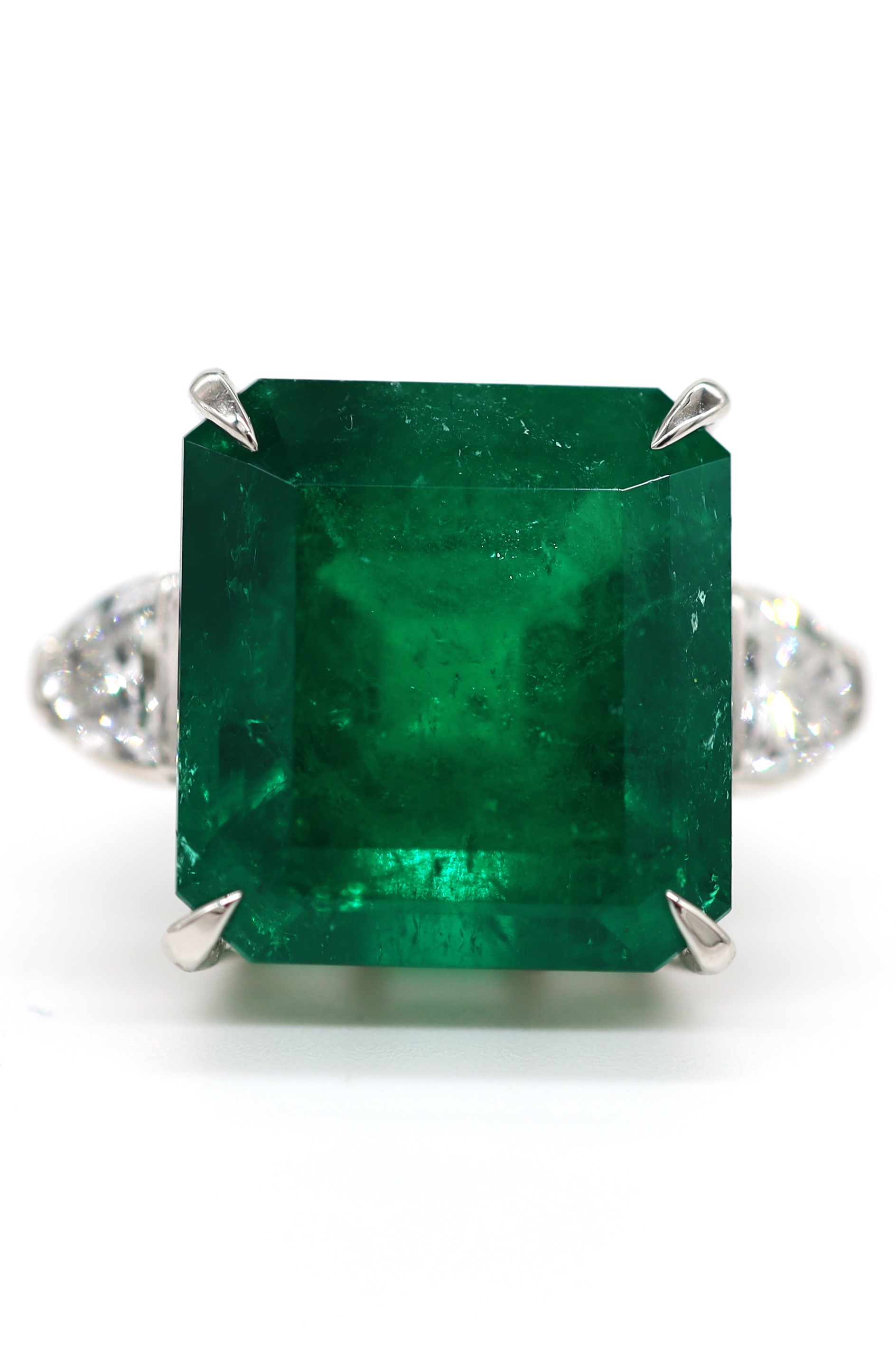 This remarkable ring showcases a magnificent 16.93 carat natural emerald, certified by GRS, displaying an exceptional vivid green color. Originating from Colombia (Muzo mines), the emerald is noted as minor treatment, preserving its rare and desirable quality. The center stone is elegantly complemented by 0.99 carats of diamonds, and beautifully set in PT900 platinum. With a total weight of 15.8 grams, this refined piece embodies rarity, prestige, and timeless sophistication.