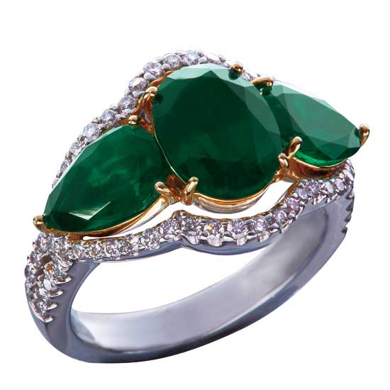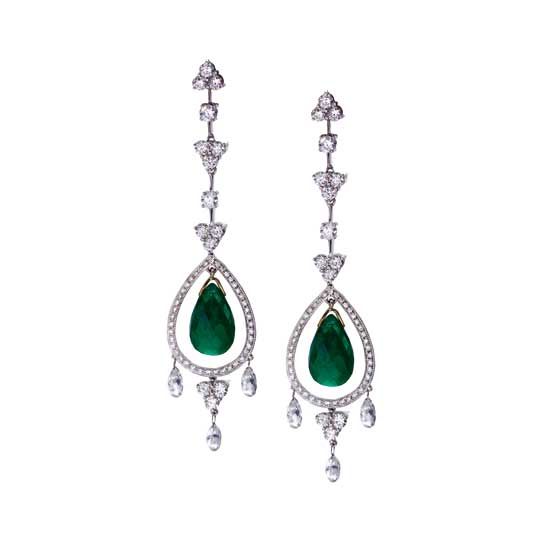 The jewelry set features a vivid green emerald ring weighing 4.14 carats. The matching chandelier earrings suspend two faceted water-drop-shaped emeralds surrounded by diamonds. The briolette diamonds on the edges bring out the femininity of the wearer.
