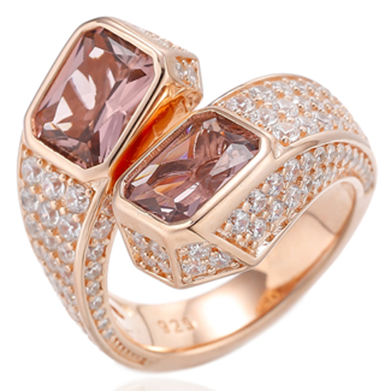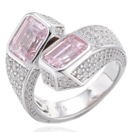 Emerald Shape Morganite Nano And Round White Cubic Zircon Rhodium Silver Ring