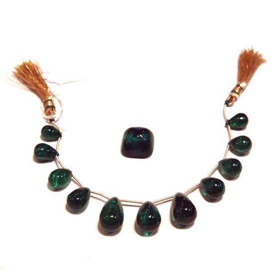Pictured here is a strand of pear shaped emerald stones. Each emerald stone flaunts a deeply saturated green hue that creates an eye-catching color contrast with the gold-tone strand and tassels to both ends. Included also in the set is a loose emerald with cabochon cut.