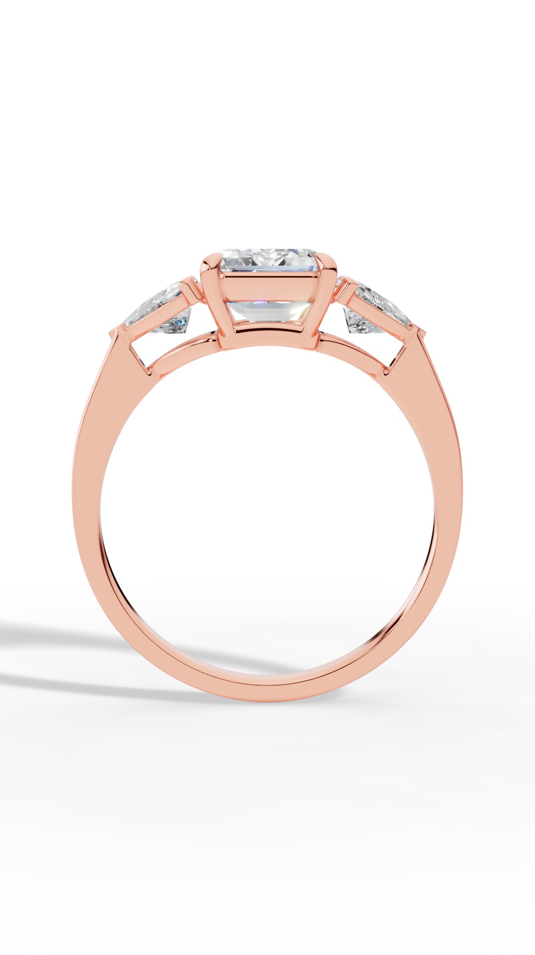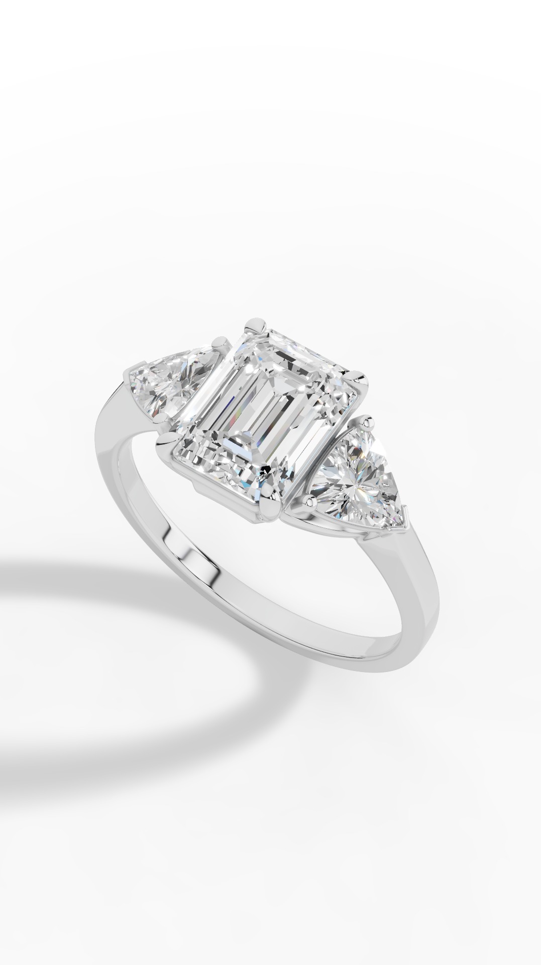 The emerald and unique trillion cut ring features a captivating lab grown triangular trillion diamond paired with an elegant emerald cut, creating a bold, modern solitaire with striking brilliance.