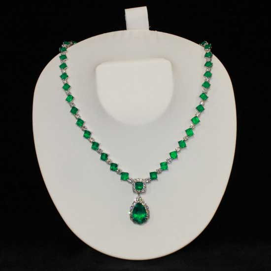 This is a beautiful necklace setting with enchanting emeralds. The design features a pear-cut emerald pendant accompanied by multiple square-cut emeralds on the necklace. Every emerald is embellished with diamonds to showcase breathtaking beauty.