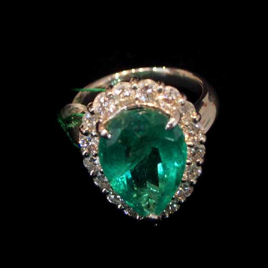 This pretty ring spotlights a drop-shaped green emerald encircled by tiny white diamonds. Crafted of glimmering platinum, the ring band showcases a highly polished finish. The elegant ring makes a great addition to any lady's wardrobe.