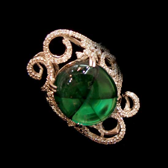 This elegant ring feature an oval-shaped emerald cabochon adorned by scrolls of tiny white diamonds. The beautiful 18K white gold ring glimmers with a highly polished finish. The auspicious green emerald ring will bring good luck and well being to the wearer.