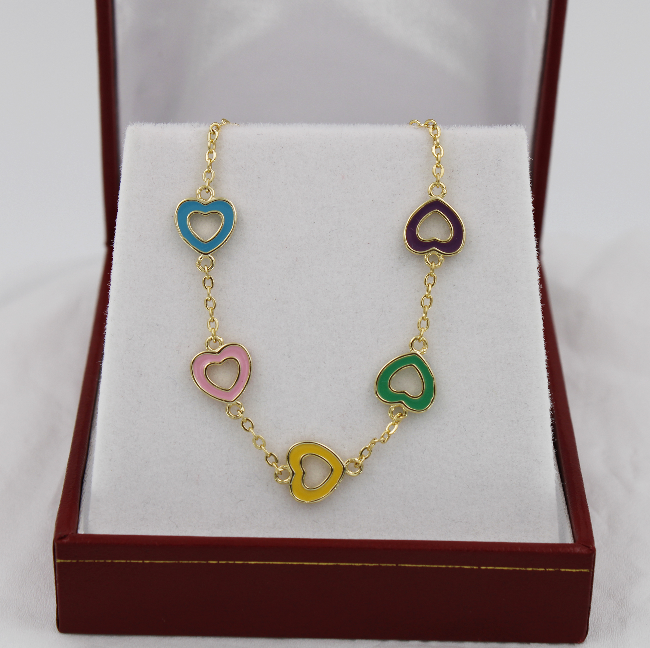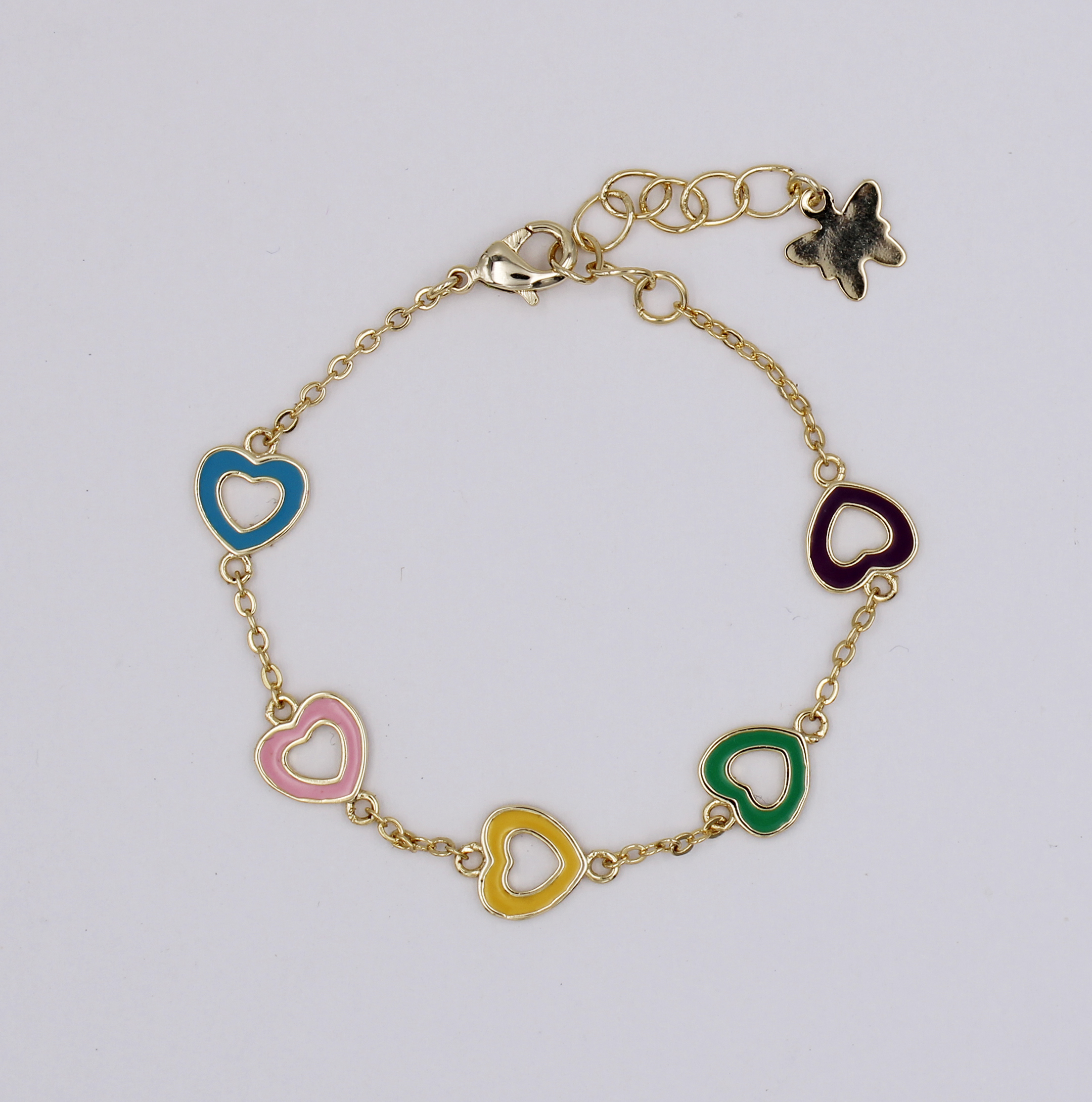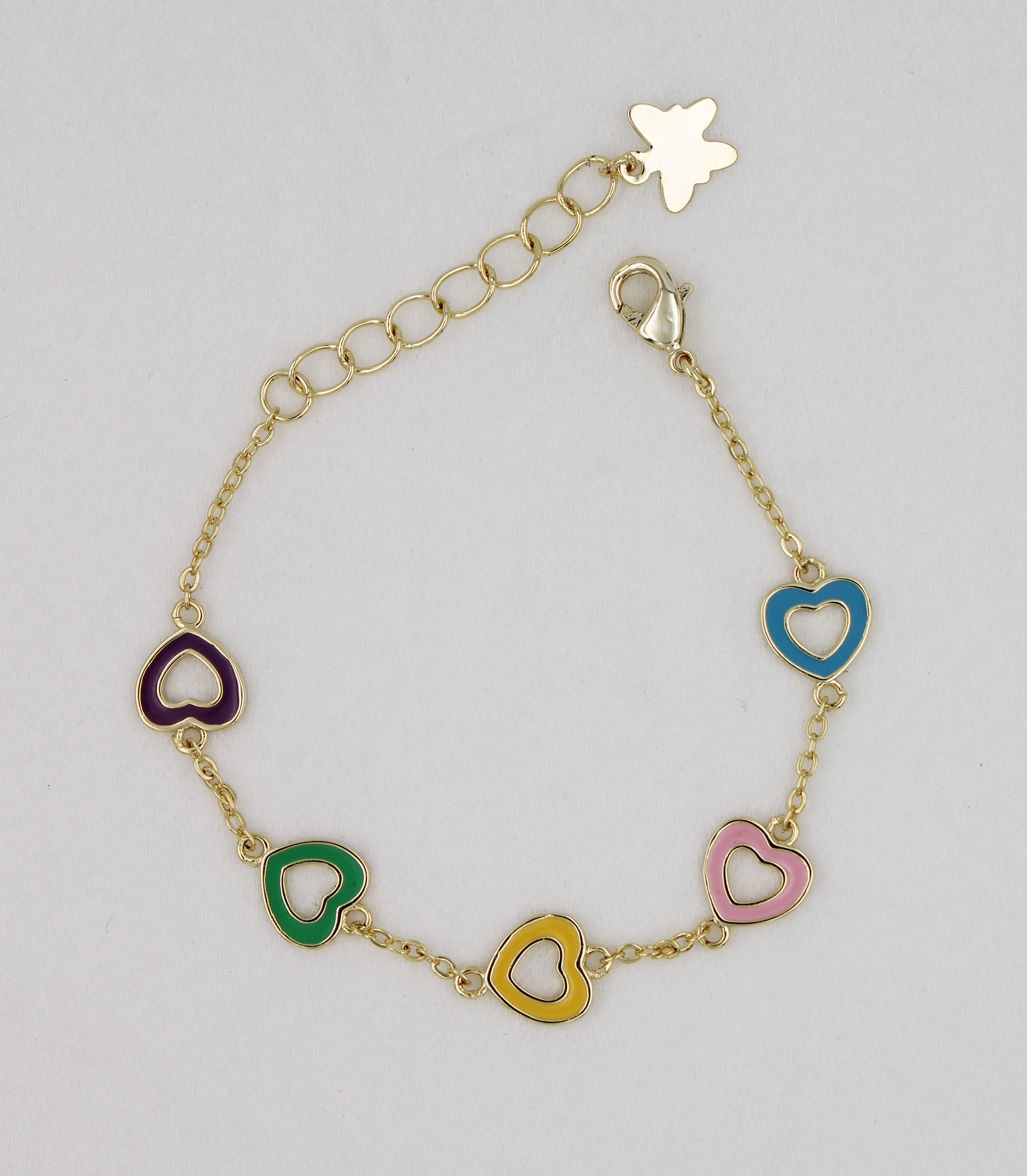 13cm + 1" ext. chain, brass chain bracelet consisting of 5 pc. of 8mm heart shape charm in multi-color (blue, pink, yellow, green & purple enamel), closing by 11mm lobster clasp, all metal are brass in 1-3 mil 18K gold plated + e-coated, free of nickel.