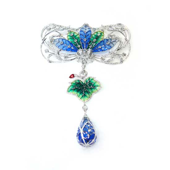 Featured is a brooch with a complicated design in terms of structure and colors. The brooch is finely built with 18K white gold, diamonds, and enamel. The gradient blue and green hues characterize this one-of-a-kind piece.