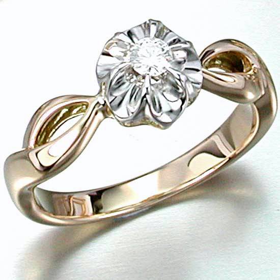 This ring features a stylish slim band in a golden color. The top has a clear-cut diamond surrounded by a floral-design supporting backdrop. This classic ring is ideal as engagement ring.
