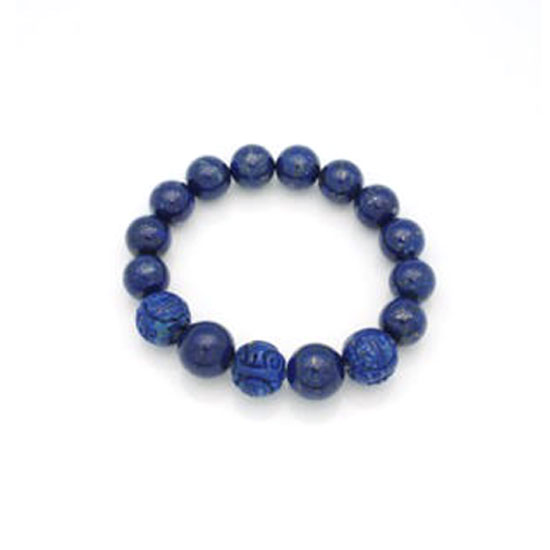 This is a semiprecious stone bracelet with a dainty and neat design. It is finely strung with top-quality lapis lazuli beads. Among three pieces, it has a center bead with an oriental Chinese style carving.
