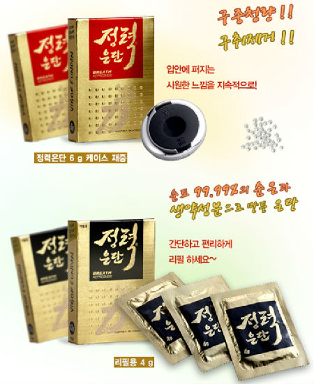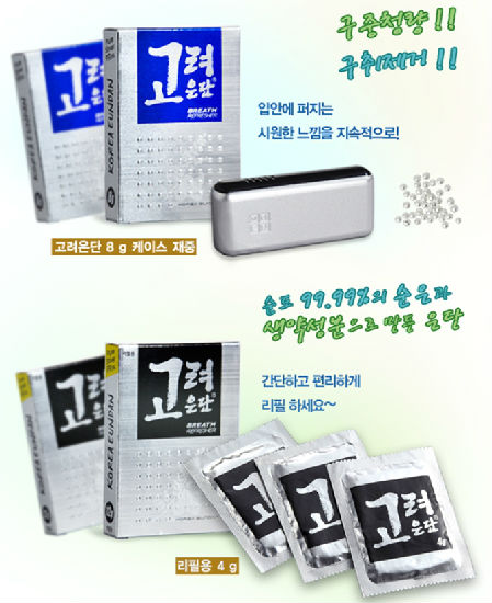 It is circle-shaped breath refresher consisting of silver and 8 to 9 kinds herbal ingredients. It continuously disperses coolness in the mouth. There are three types of it, Eundan, Korea Eundan, and Vigor Eundan. Each one has different herbal ingredients. Especially, Vigor Eundan has ginseng in it. Vigor and Korea Eundan have permanent container so once it is used up it can get it refilled.
