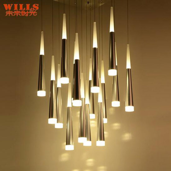This European LED pendant lamp features several individual lamp bodies in tapered shapes. It is made from top grade aluminum for a rugged construction. It helps create an artistic ambiance to any interior design.