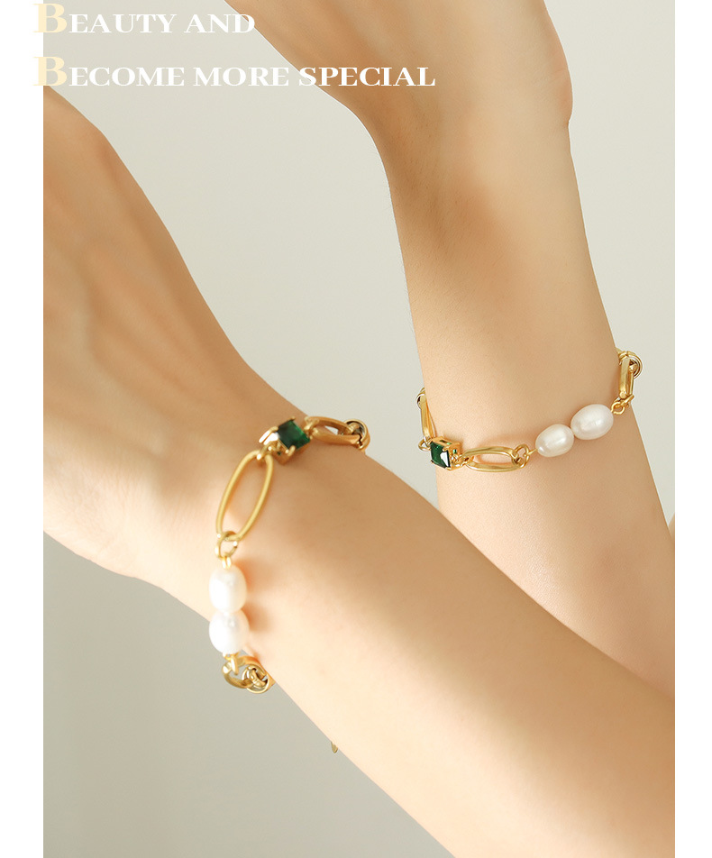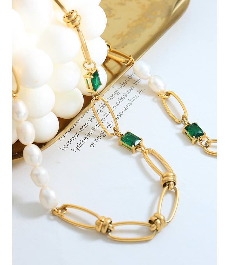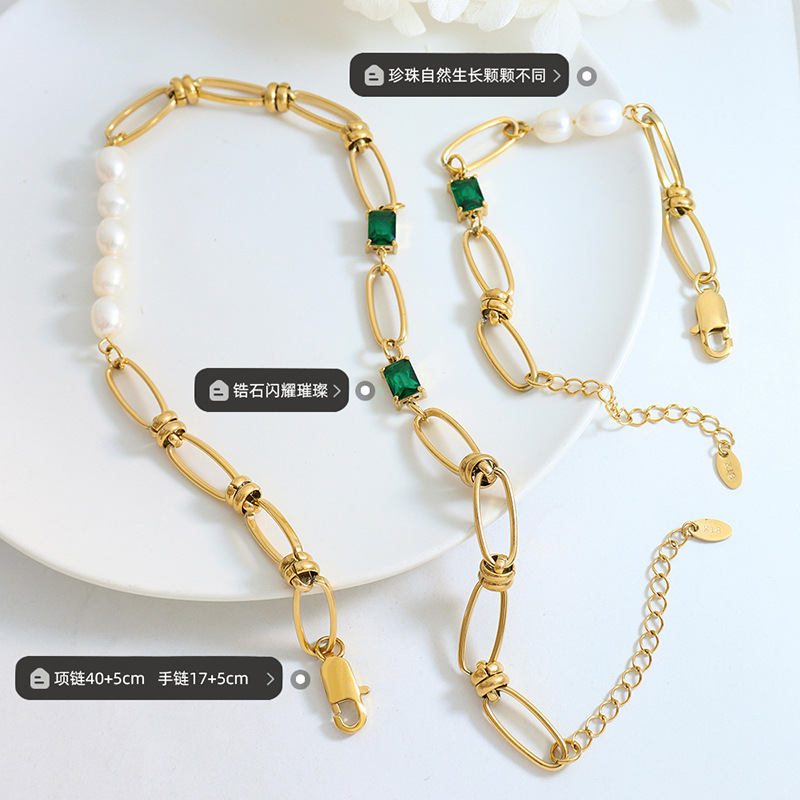 European and American Green Zircon Freshwater Pearl Thick Chain Set Necklace He Necklace Bracelet Two Piece Jewelry Set