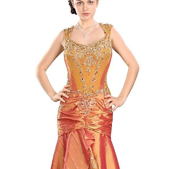 This evening dress is in the color tone of orange. It is decorated with beads in various designs throughout the dress, including a heart-shaped pattern at the waist. The dress is suitable for formal and social occasions.