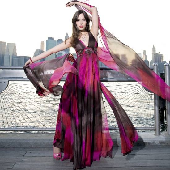 The stunning halter gown flaunts a floor length and empire waistline for a flattering fit. The deep V-neckline showcases the lady's perfect silhouette. The tie-dyed silk layering simply makes this dress stand out from the rest.