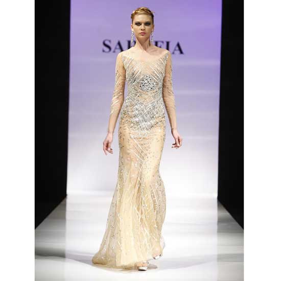 Featured is a long dress characterized by its stunning texture and beaded details which are accentuated by an airy and flared bottom. It is exquisitely tailored to refine your feminine silhouette. This evening dress is finished with a low scoop neck to show off your sexy collar bones.