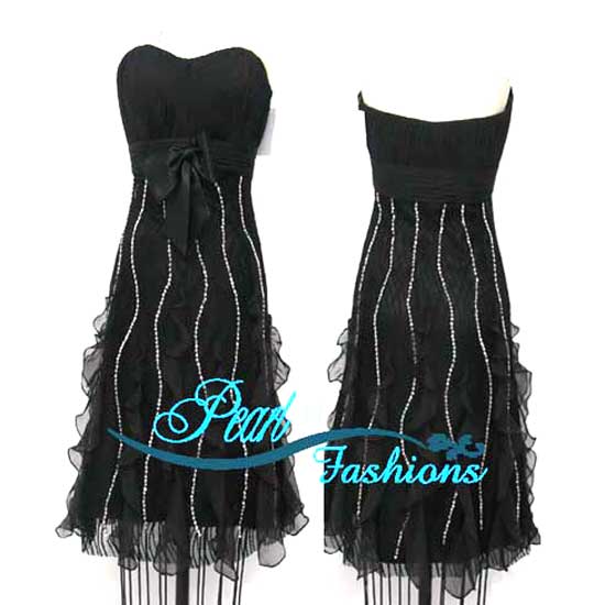 Showcased is an evening dress coming with a sexy tube cut. The bodice features a sweetheart neckline, while the skirt is formed by layers of taffeta. Shiny silvery sequins are added on the all-black dress as embellishment.