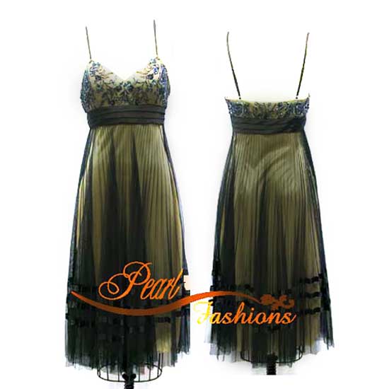 This evening dress is designed with a sweetheart neckline and spaghetti straps. The bodice features delicate ruffles and floral prints. The double-layered skirt comes with a see-through organza to showcase a graceful design.