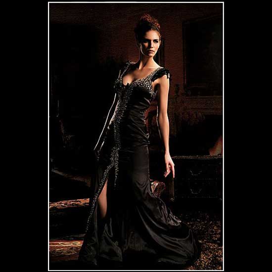 This evening dress flaunts a fitted top and an extra long bottom for a deluxe style. The sleek bodice and silvery adorning elements display a splendid design. This gorgeous dress simply makes the wearer a focus in evening parties.
