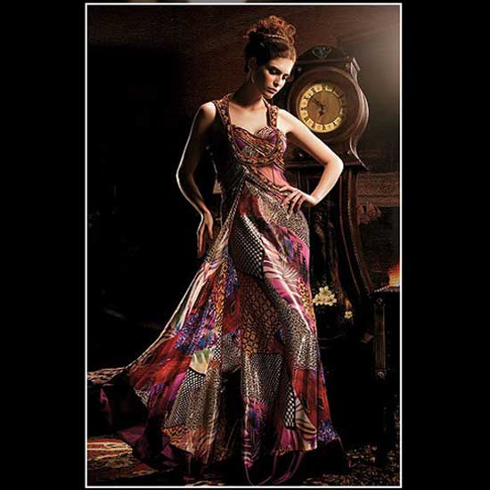 This evening dress features allover vivid patterns in fragments. The exotic style flaunts extreme uniqueness that is unmatched with no other dresses. Be the spot in an evening party with this exotic dress.
