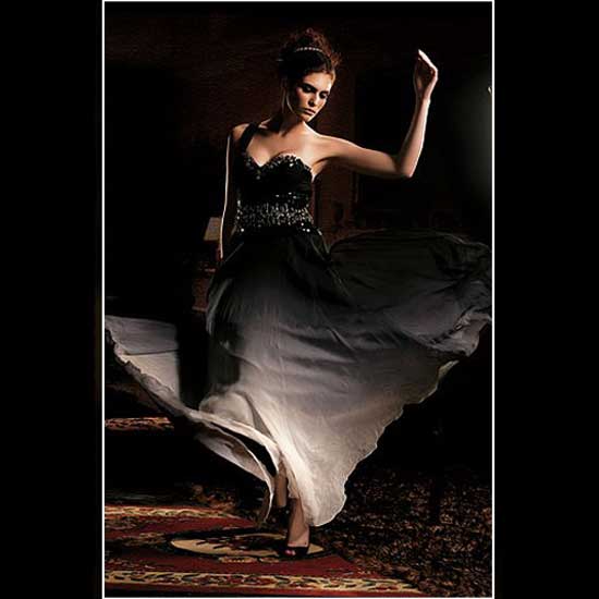 This evening dress boasts an impressive off-shoulder design. The gradient-colored bottom features loose fitting for a distinguished style. This uniquely designed dress is definitely the spot in an evening party.