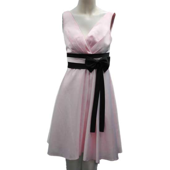 This pinkish evening dress features a V-neck with a flap-over design. The waistband comes with a side ribbon for a girlish touch. The ruffled bottom makes this streamlined dress a whimsical air, as it centers, slims and elongates the figure.