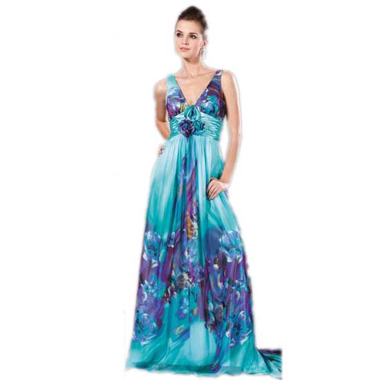 This evening dress features a V-neck with a waistband adorned by blue roses. The dress boasts floral prints with a rippling visual effect. The subtle color transition offers a celestial touch. Add a dash of spice to your evening attire in this awesome dress.