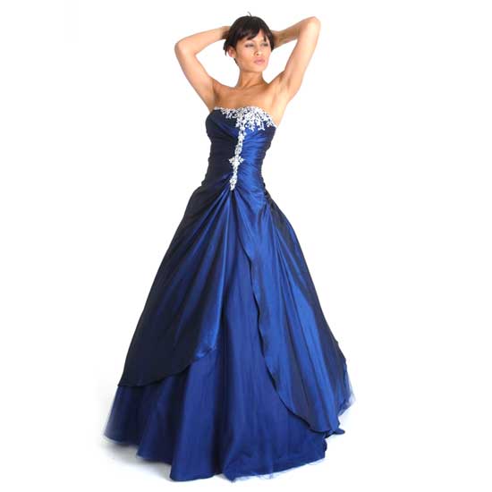 Pictured here is an evening dress made of satin, organza and taffeta. It features a low-cut and gathered bodice for highlighting the wearer's beautiful silhouette. In particular, the right front is adorned with delicately-crafted trimmings.