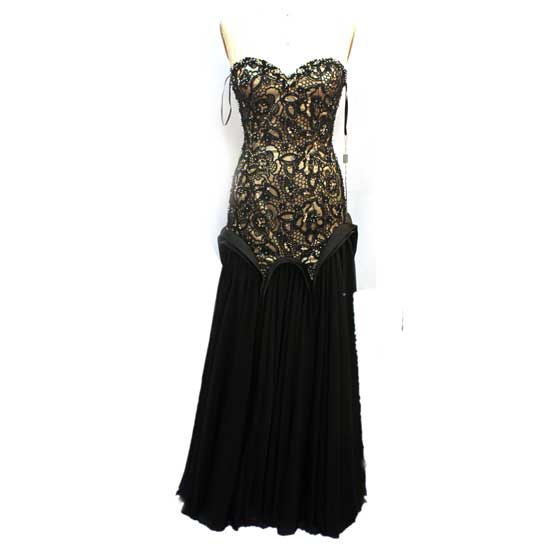 This charming evening dress is sure to steal the limelight at cocktail parties. This evening gown flaunts a sweetheart neckline and formfitting waistline to show off feminine curves. The lacy bodice embellished with beads airs a seductive and elegant touch.