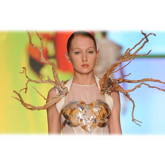 This exceptional couture evening dress is made by exotic python skin and silk fabric. It showcases a bold pattern on the sheer front. The handmade wood piece detail on the shoulder is adorned with sparkling ornaments and introduces extra textural detail to the design.