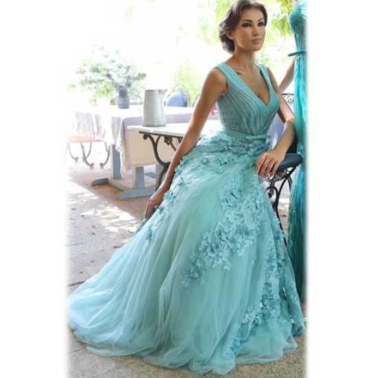 This evening dress comes in captivating light blue with a deep V neckline. The ruched details on the bodice lend an extra sense of vogue. The floor-sweeping skirt is artfully designed with floral embellishments for an elegant and chic touch.