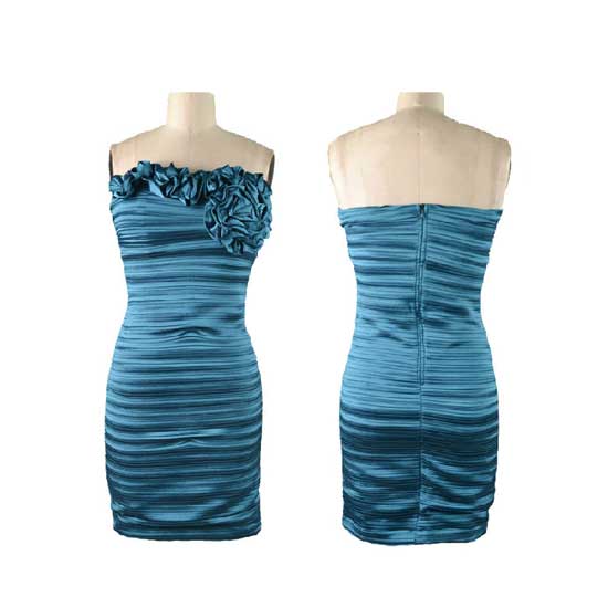 This is an elegant strapless evening dress that comes with allover pleated details and boasts a slim-fit bodice. It is made of 97% polyester and 3% spandex, ensuring ultimate wearing comfort. The flower ornaments on the bust showcase a decorative touch.