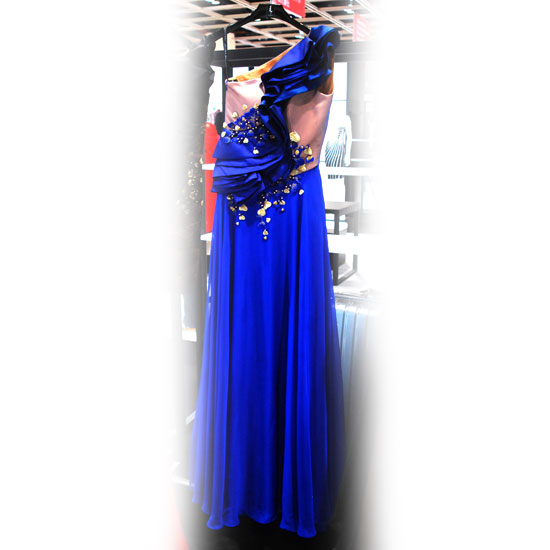 This is a gorgeous evening dress that comes with a charming one-shoulder design. It features a well-tailored upper and a pleated skirt. This refined evening dress is finished with embroidered details.