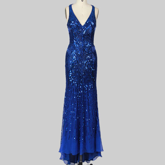 This is a ladies’ evening dress that comes in allover blue for a vibrant look. The allover shimmering beading details add a touch of elegance to the whole piece. This elegant dress is finished with two shoulder straps, a low heart neckline and a slim-fit bodice.