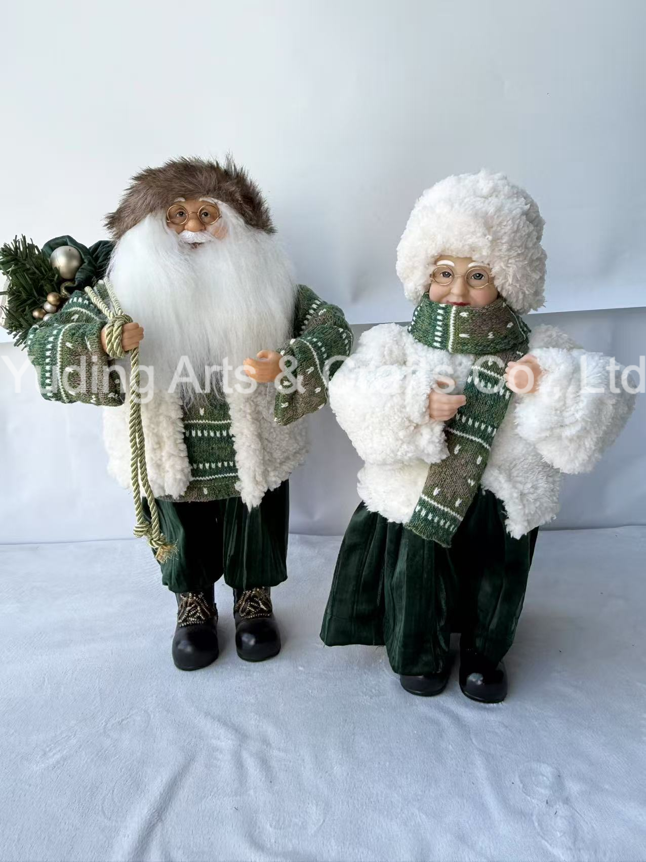 Bring a woodland-inspired touch to your holiday display with the Evergreen Forest Santa & Mrs. Claus. Dressed in deep green velvet trousers and matching skirt, both wear cozy white faux shearling coats and green knit scarves with Nordic patterns. Santa carries a festive gift sack filled with pine greenery and ornaments, while Mrs. Claus wears a soft sherpa hat. This charming duo brings the warmth of a forest cabin into your Christmas scene.