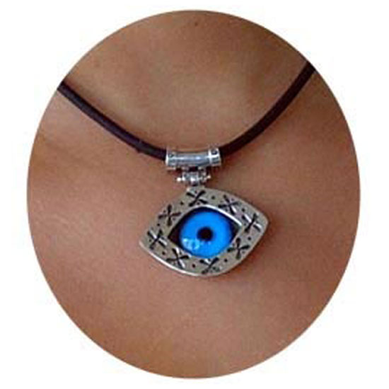 This is a tribal style necklace featuring a chocolate-brown string with an eye-shaped pendant. The bright blue iris is eye-catching and matches well with the patterned eye-shaped pendant. It completes your geometric-patterned dresses and goes equally perfect with plain top.