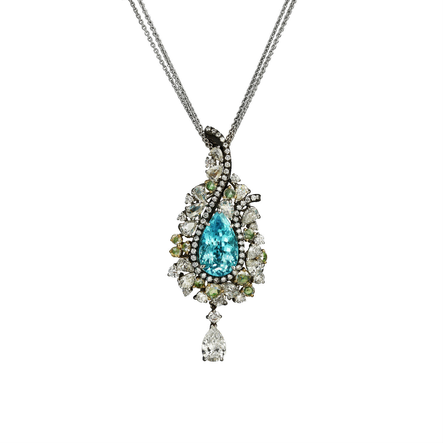 • 18K white gold set with diamond, rose cut diamond, tsavorite and Neon Paraiba. Plate with black gold.