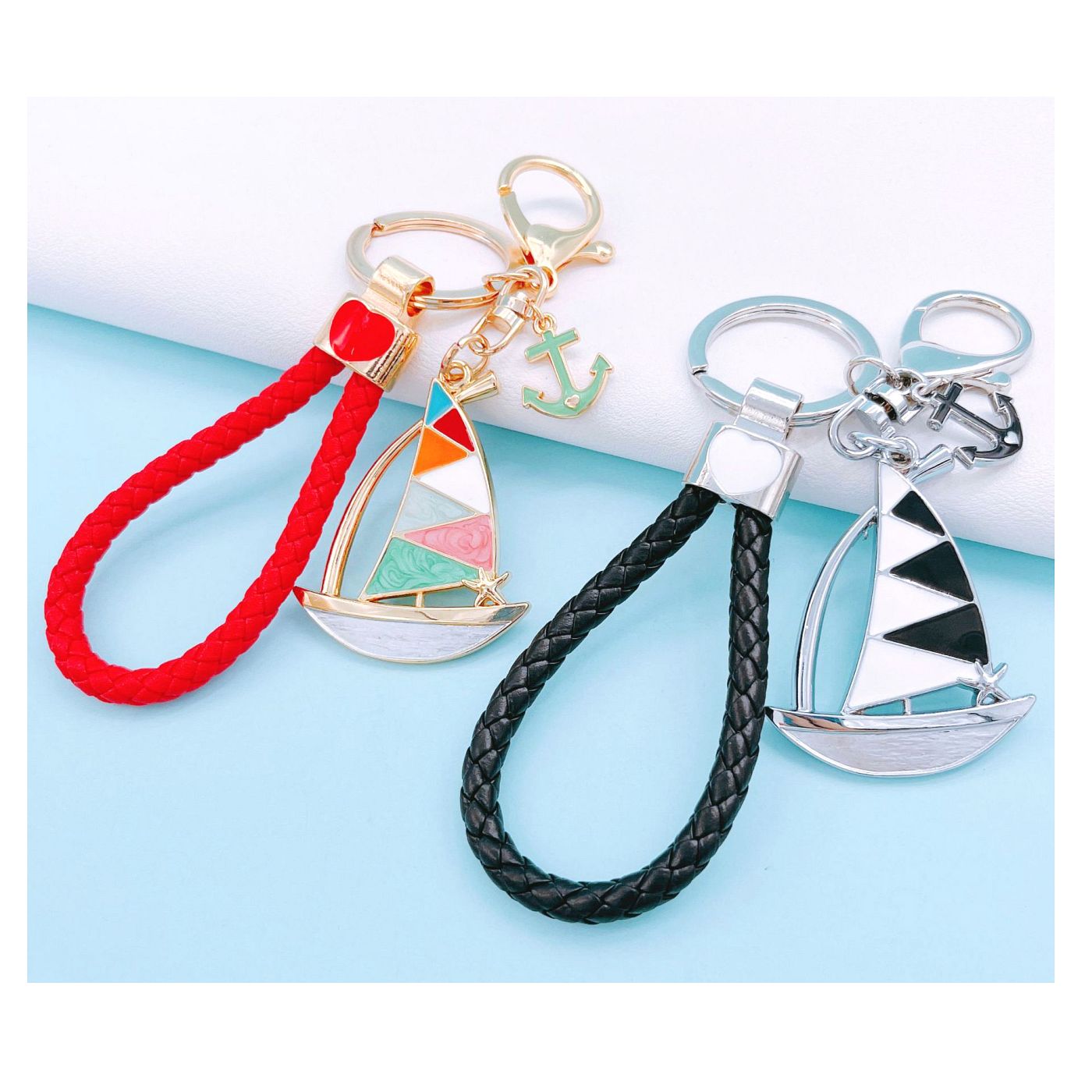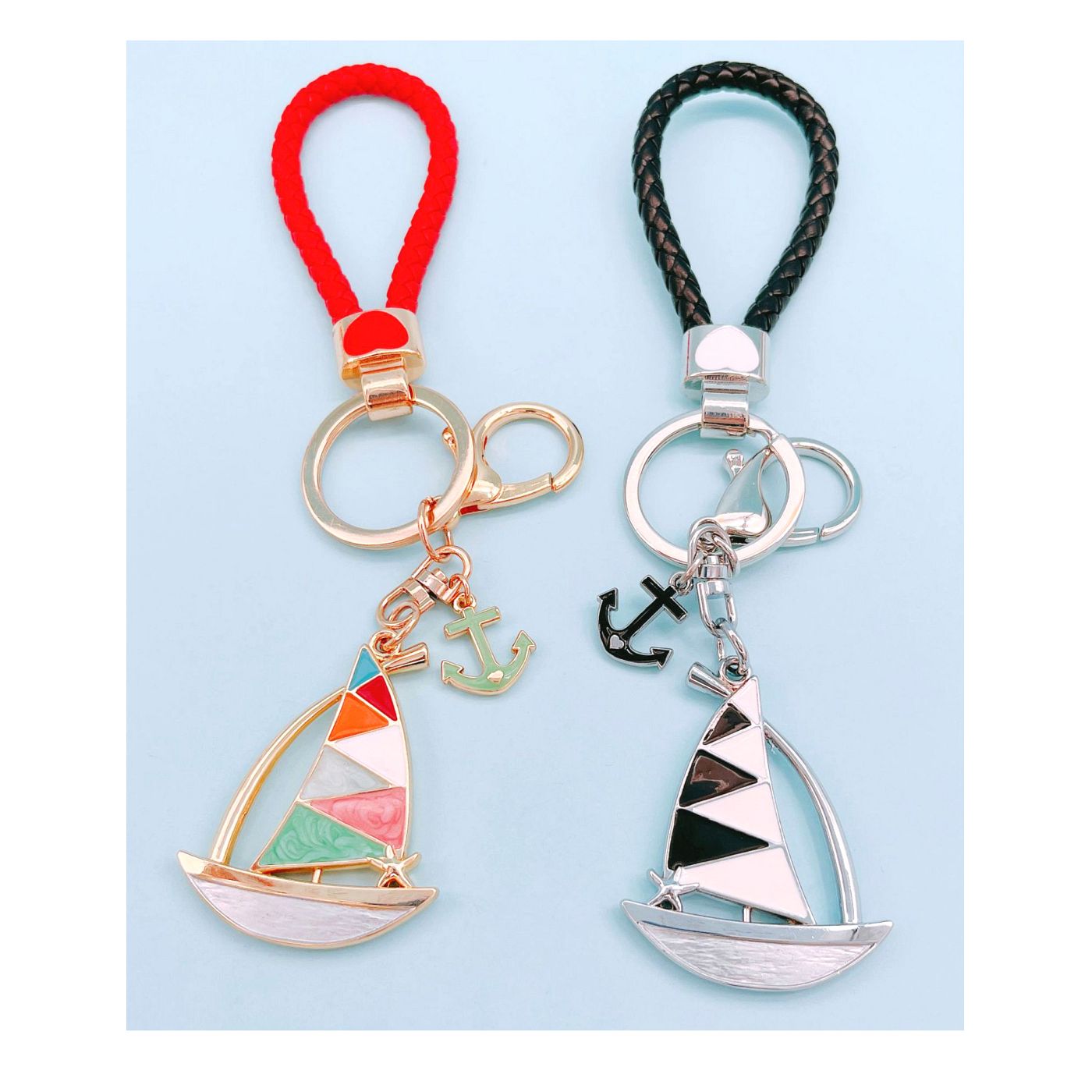 • As shown is a high-fashion boat style golden and silver plated key chain.