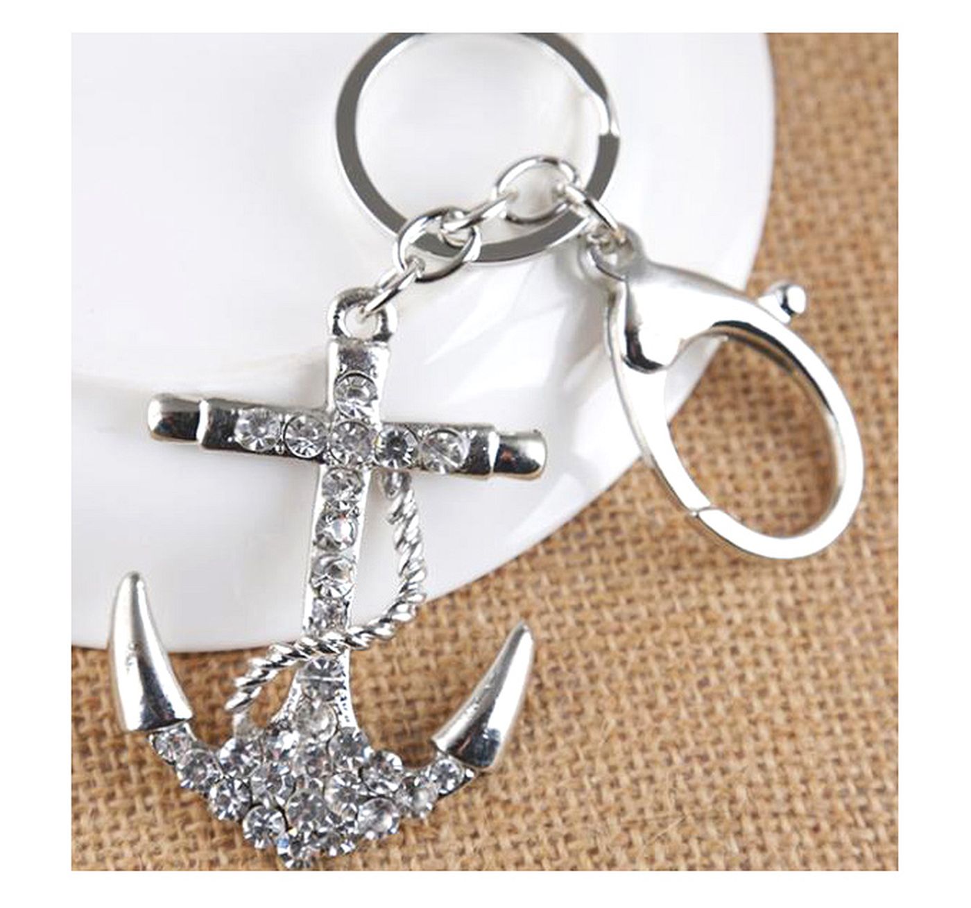 As shown is a high-fashion anchor style crystals silver plated key chain.