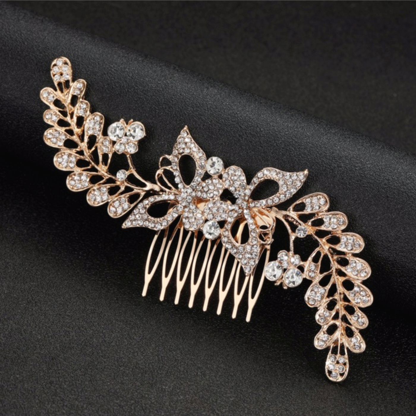 As shown is a high-fashion crystals butterfly style golden plated alloy parts lady hair comb.