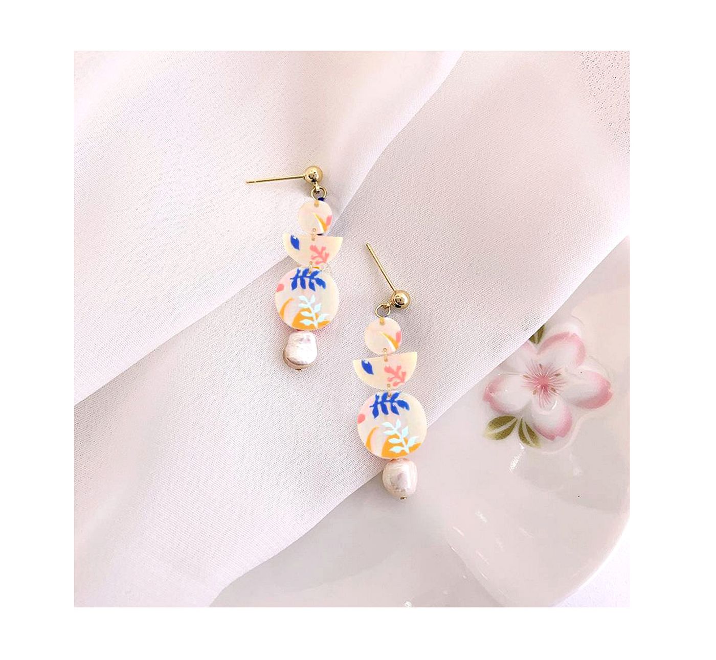As shown is a high-fashion shell styles imitation pearl golden plated alloy parts drop earring.