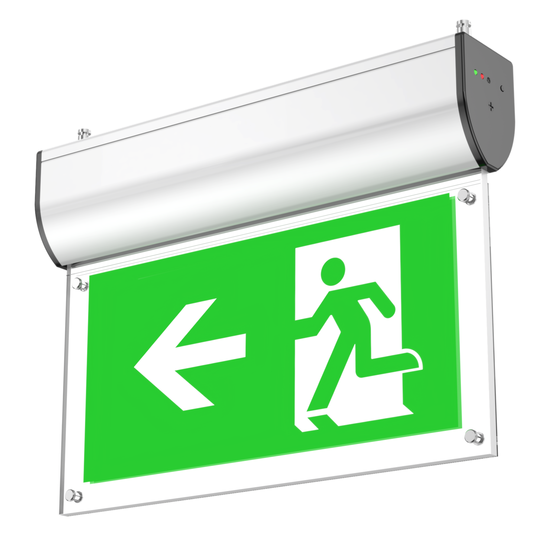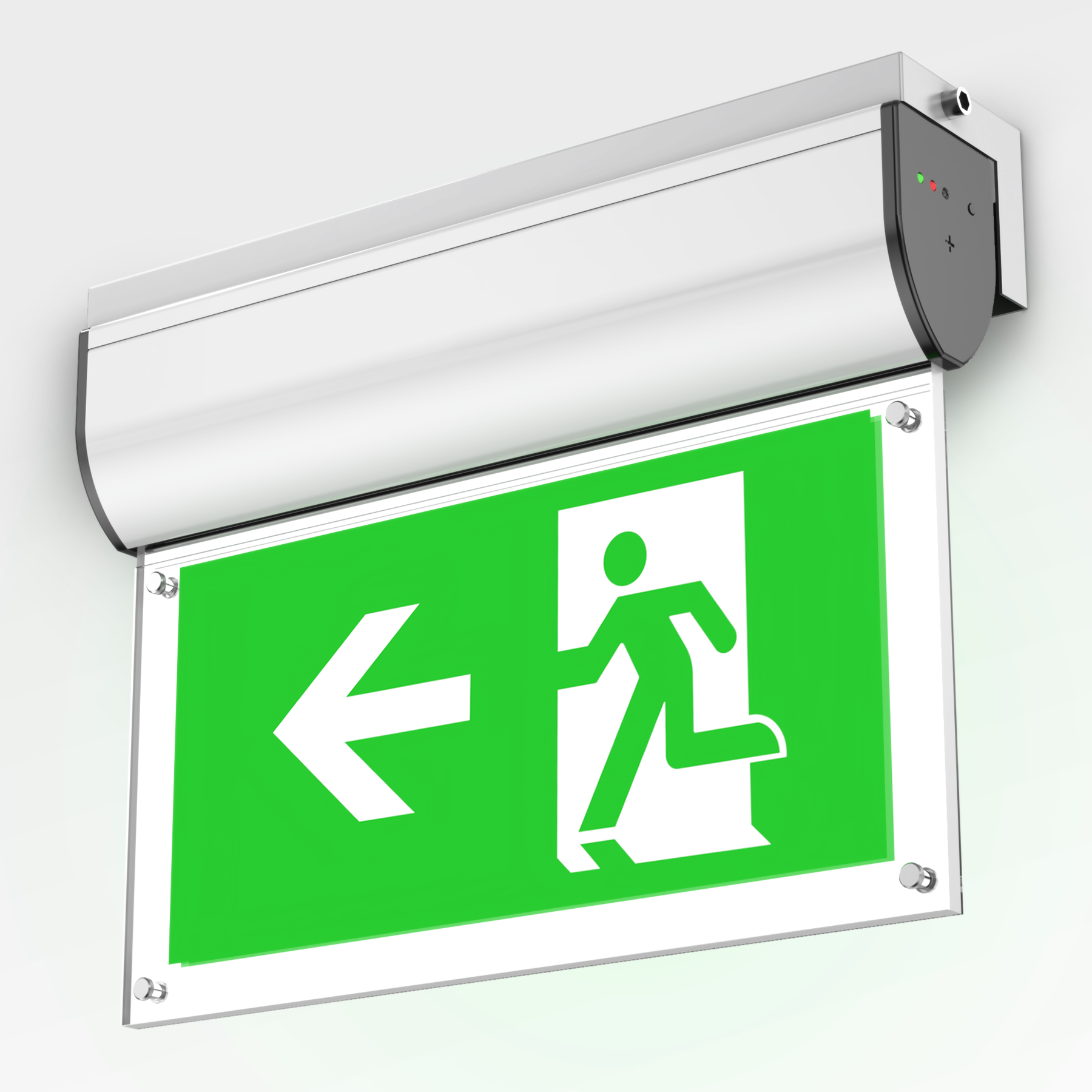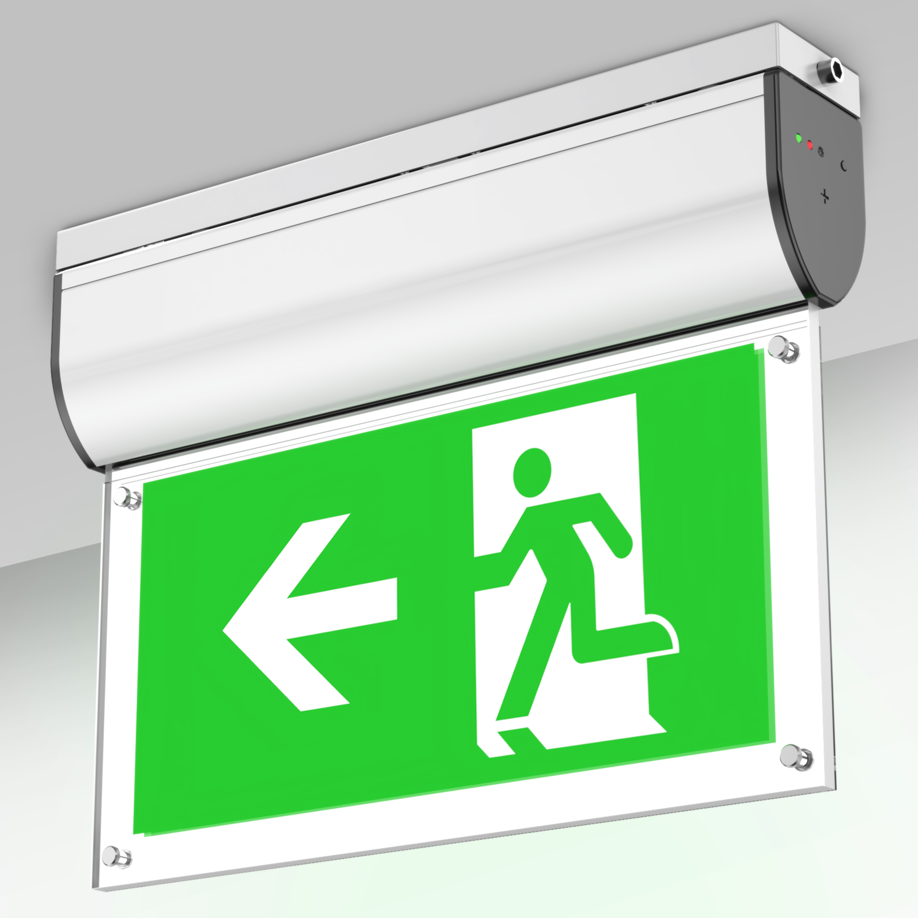 Screws fixed sign legends -- easy replacement, the legend panel is an optional part of the exit sign