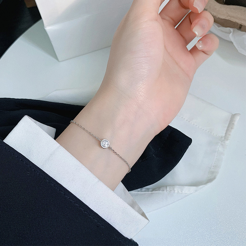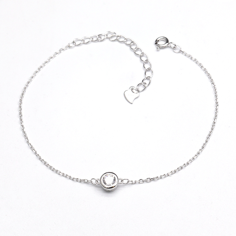 This minimalist bracelet is crafted from high-quality 925 sterling silver, featuring a fine, sleek cable chain centered on a single bezel-set cubic zirconia stone. The round, clear stone catches the light with a subtle, elegant sparkle, creating a delicate focal point against the understated chain.