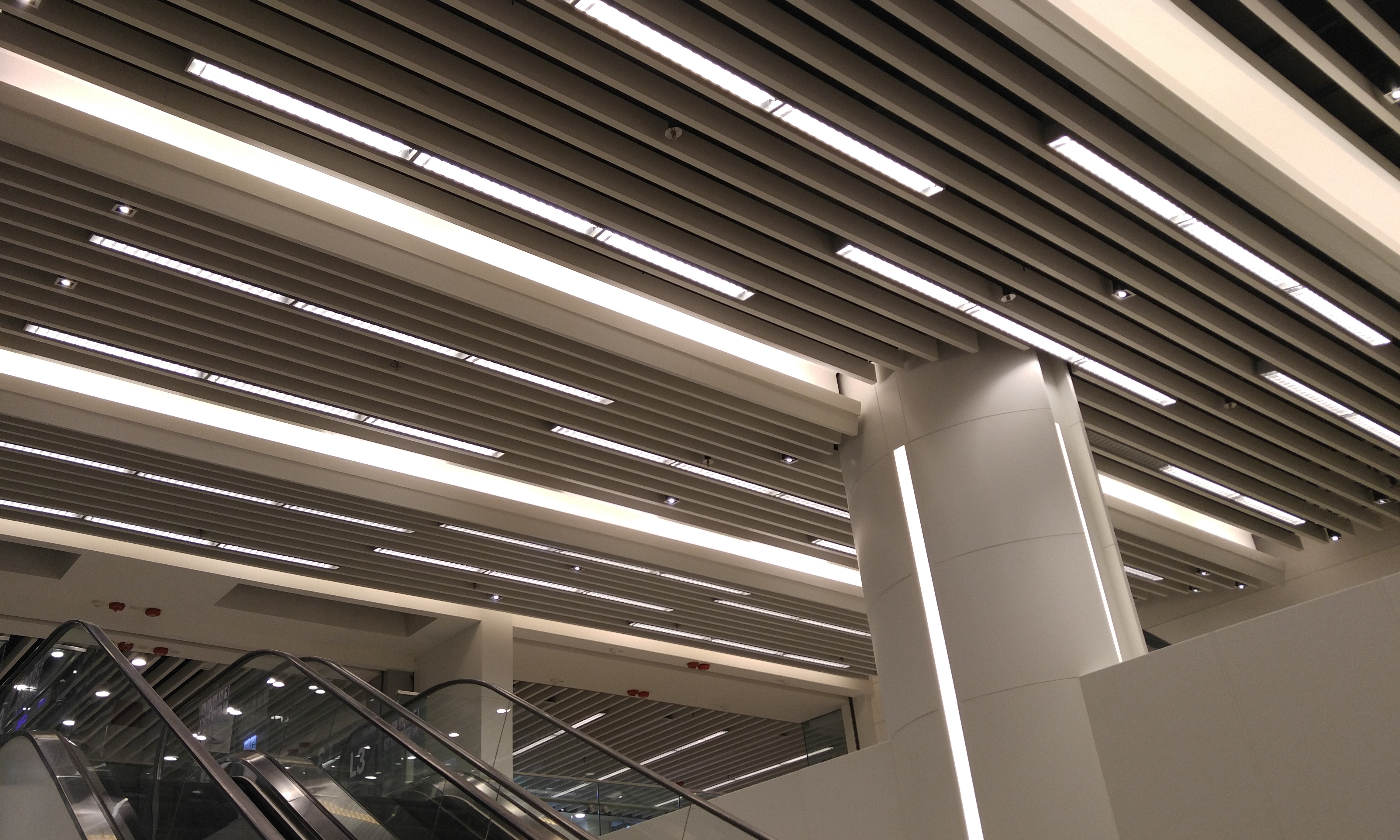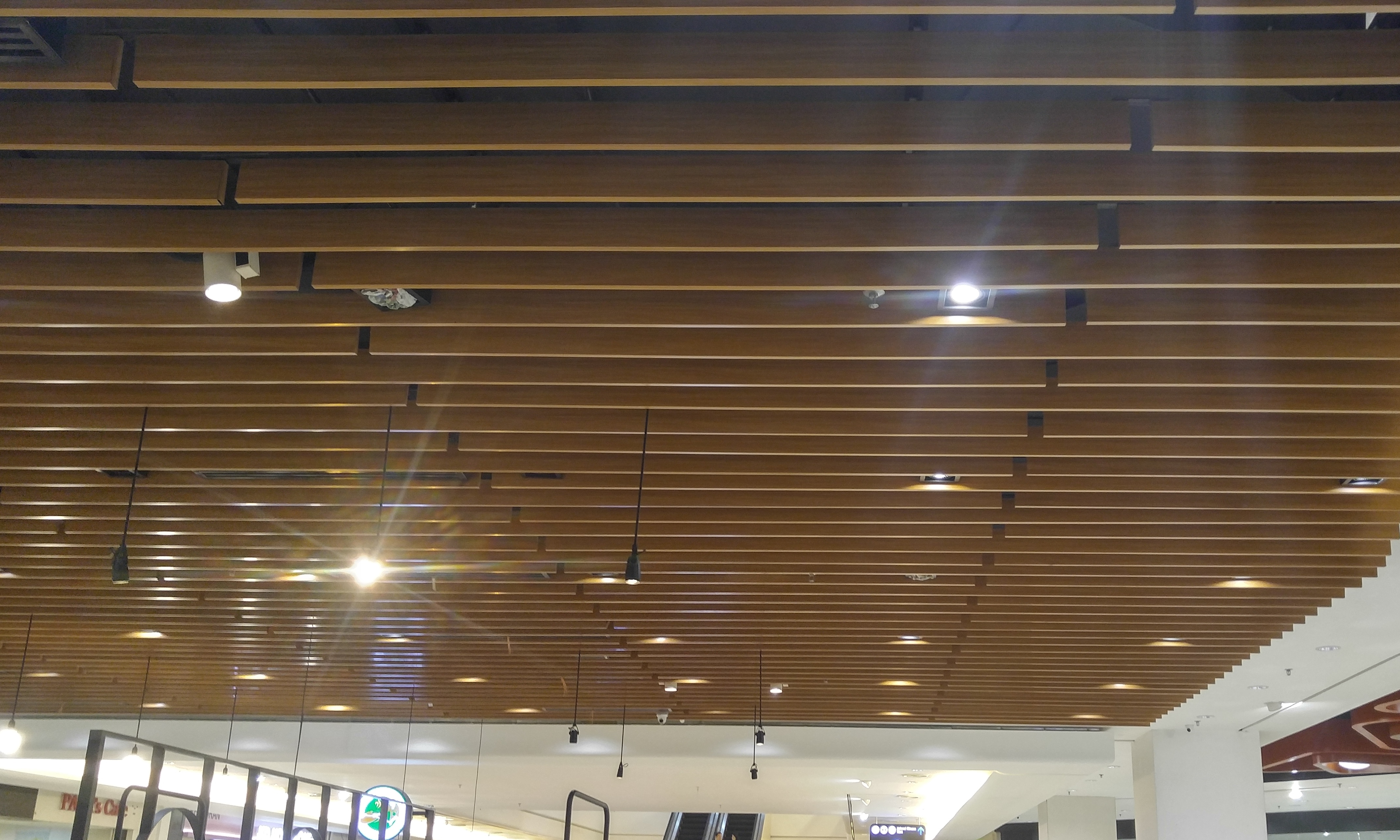 An open grid with vertical baffle panels made in extruded aluminium hollow sections with variable sizes in width and height. The baffle panels are fixed to the suspended pierced grids at the intervals of multiple 25 mm spacing slots. It is flexible in designing the open gap spacing between the baffle panels for interfacing with lighting fixture, sprinklers, loudspeakers, air diffuser and advertising banners. It is ideal open ceiling system for shopping outlets, shopping malls, transportation terminals, recreational facilities where frequent access to the building services above ceiling is required