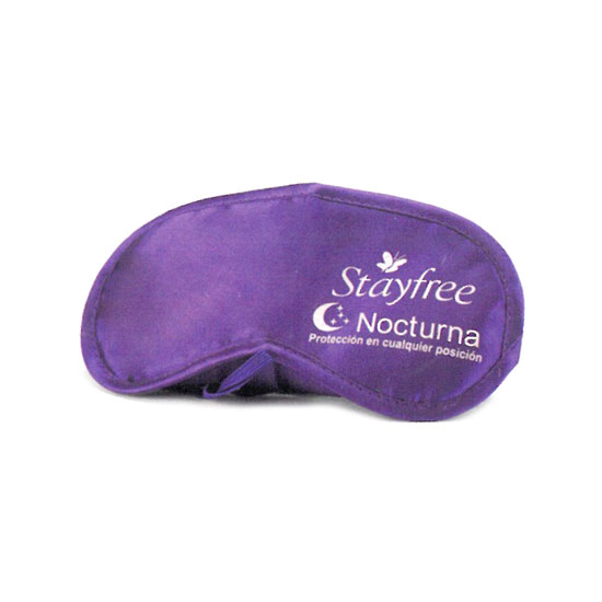 This is a satin eye cover that is printed with a "stay free" sign on the right hand side. This eye cover soft in texture for optimum wearing comfort. This eye cover is a good way to prevent disruption caused by light emitting devices.