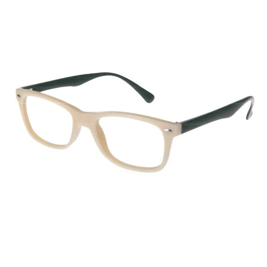 This is an eyeglass frame that comes in a fashionable bi-color style. The rims are designed in a pearl color, forming a contrasting effect with the black temples. This high quality eyeglass frame is comfortable to wear.