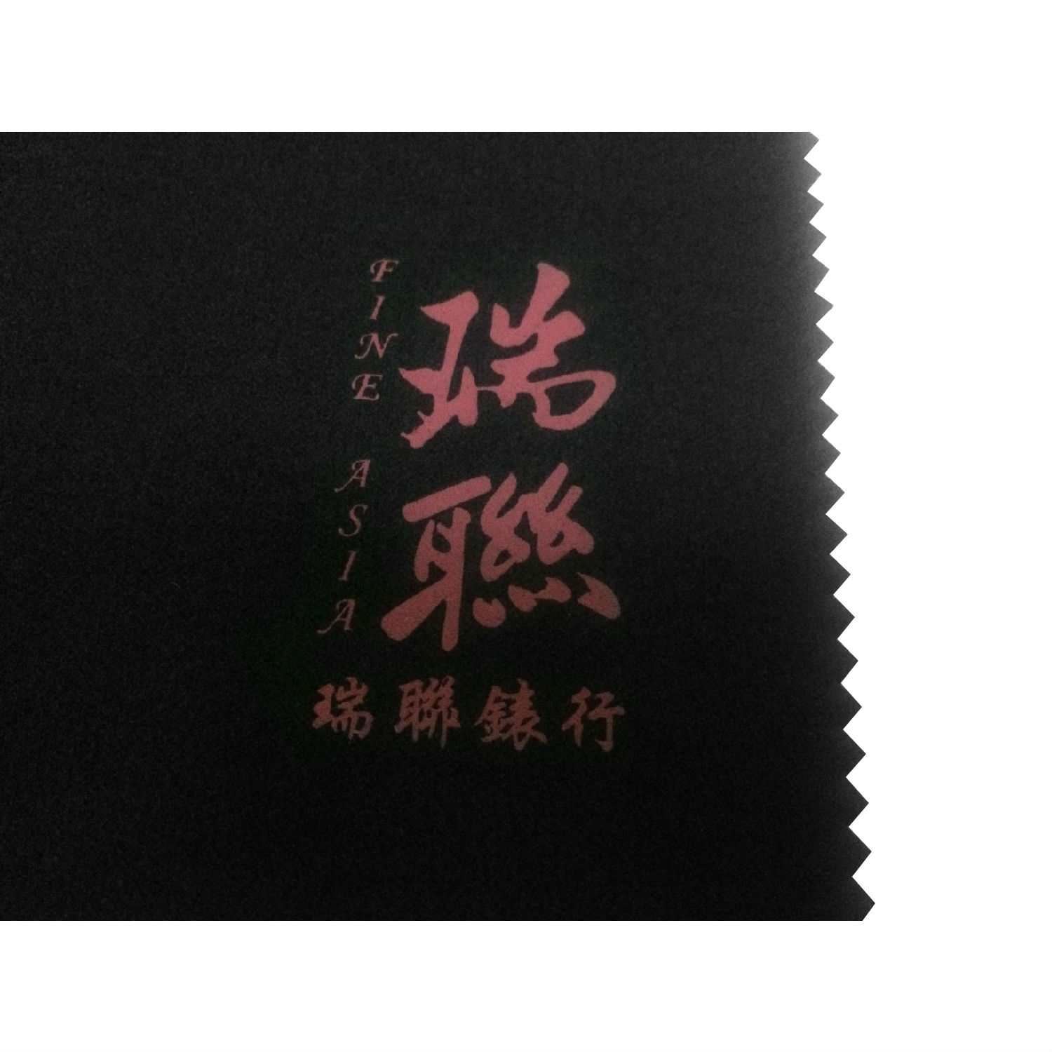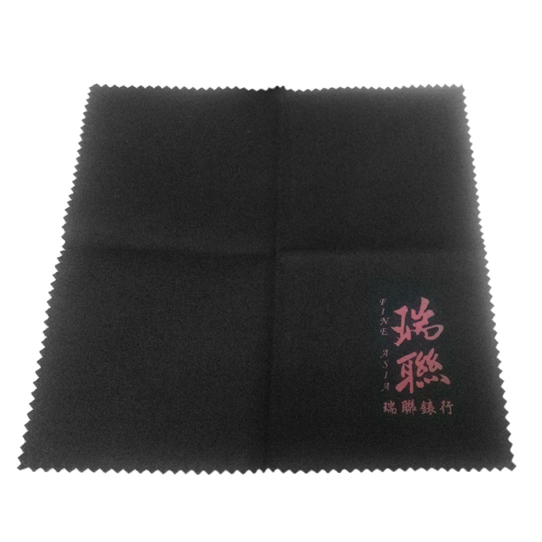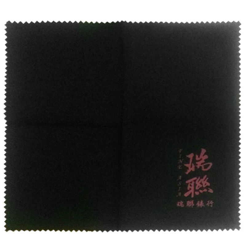 Black clean cloth displayed is made of microfiber material with silk printing brand name