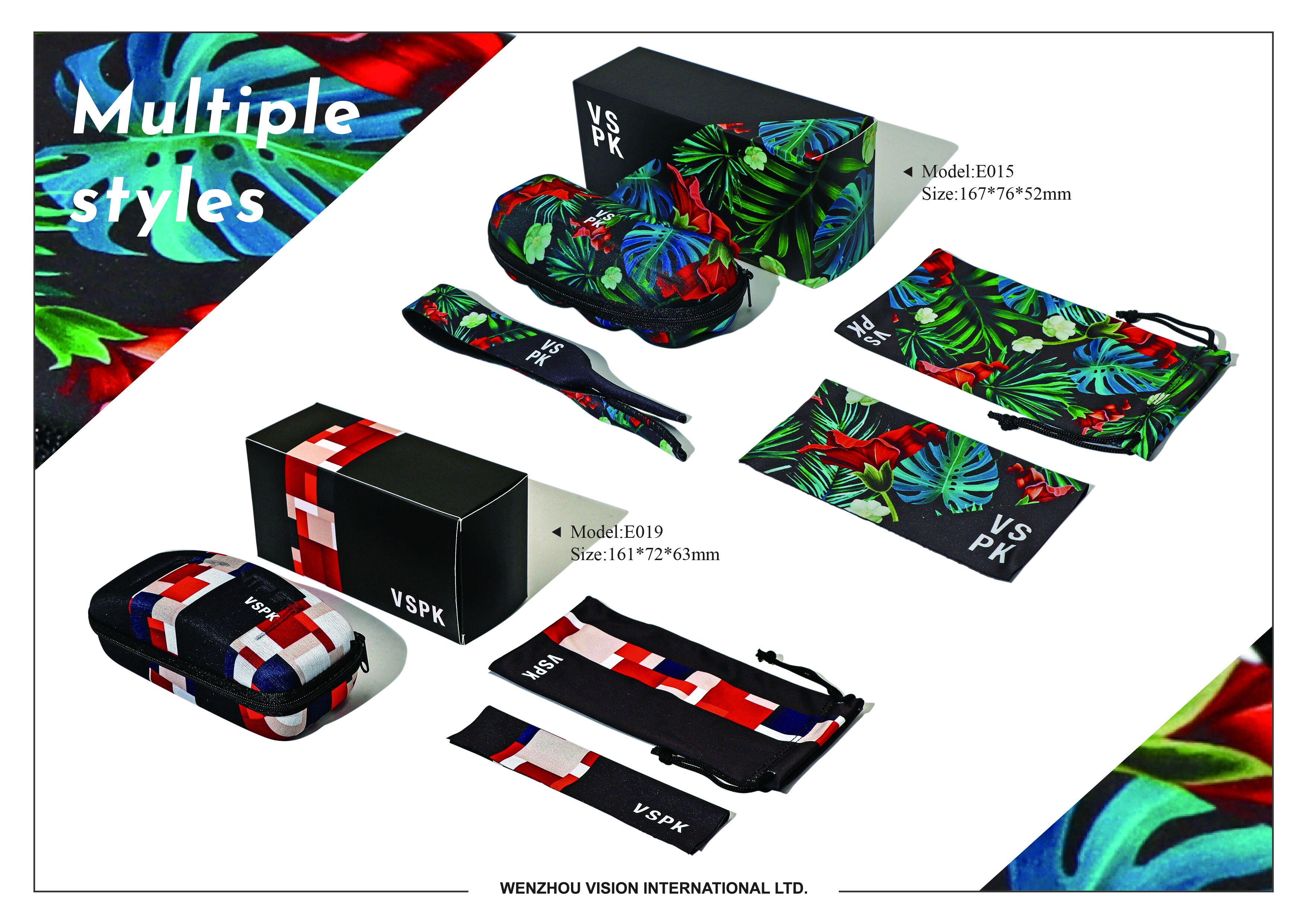 This eyewear packing set are including of the paper box, EVA case, pouch, cloth and eyewear cord. Different colors available