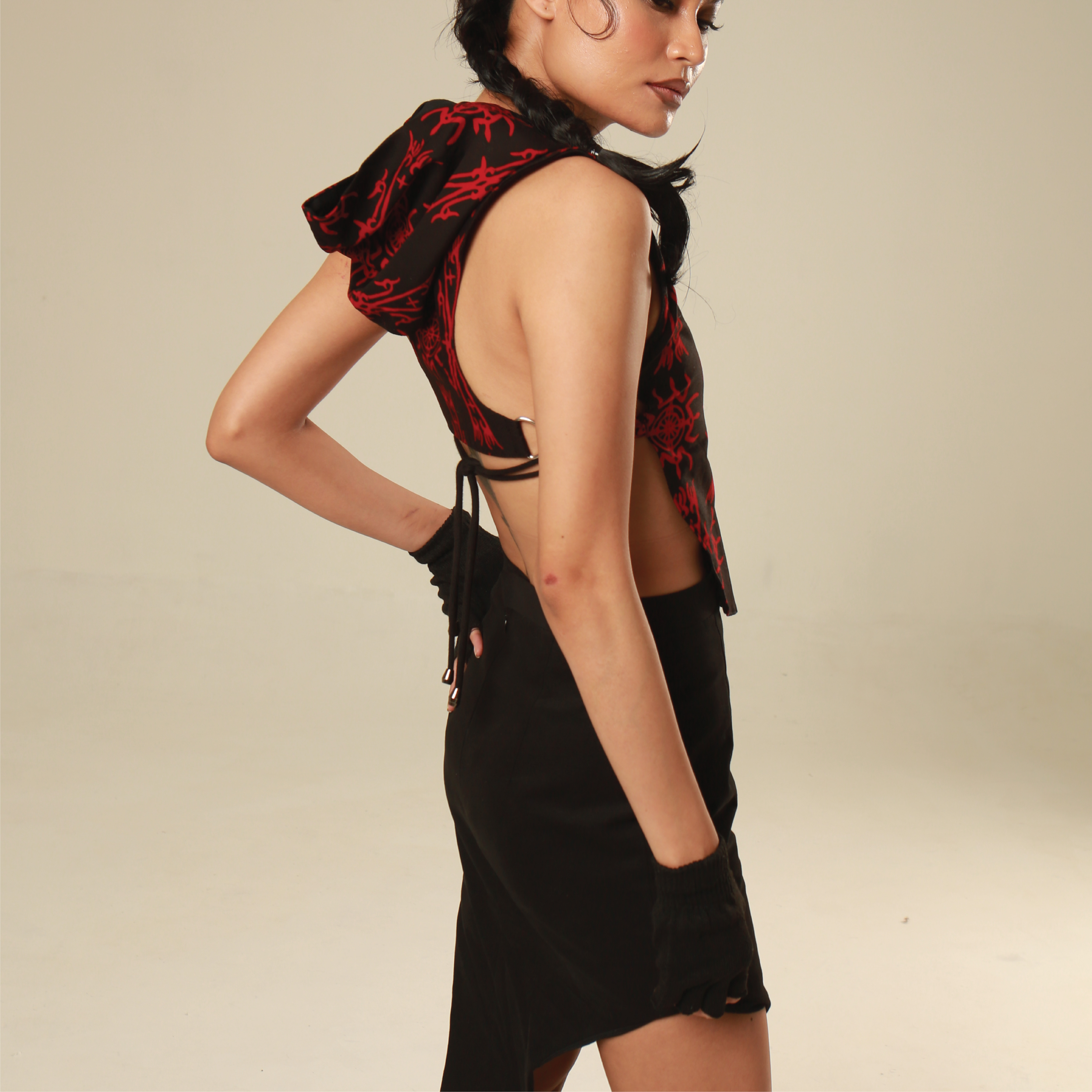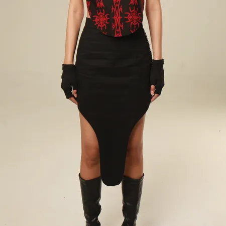 This skirt features a unique silhouette that creates a bold, futuristic look. Made from smooth yet sturdy black canvas. Includes geometric pattern details on one side—drawing inspiration from the form and philosophy of Salawaku, a traditional weapon from North Maluku, Indonesia. The extended front cut adds an edgy, daring character, making this piece a strong fashion statement that blends modern style with cultural heritage.