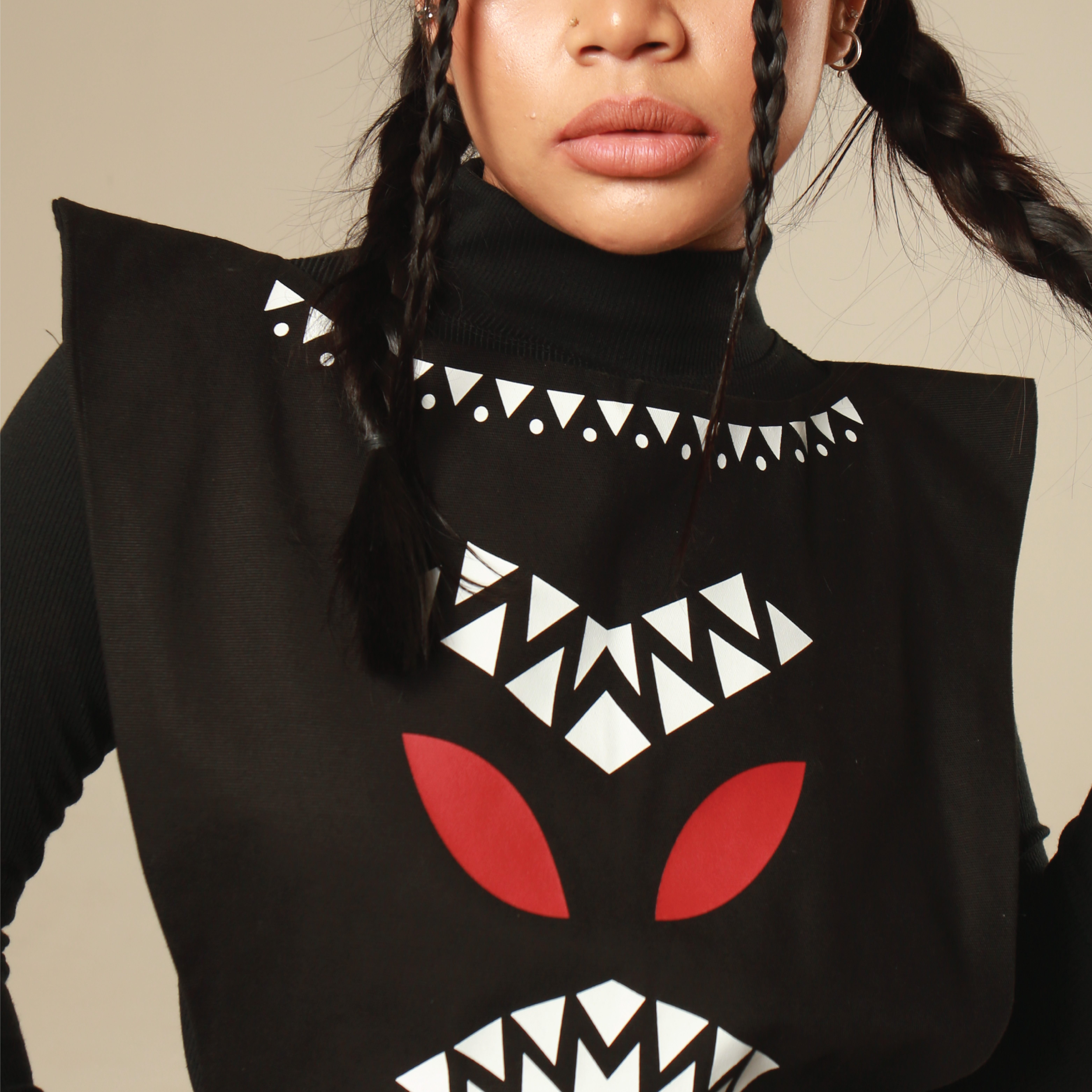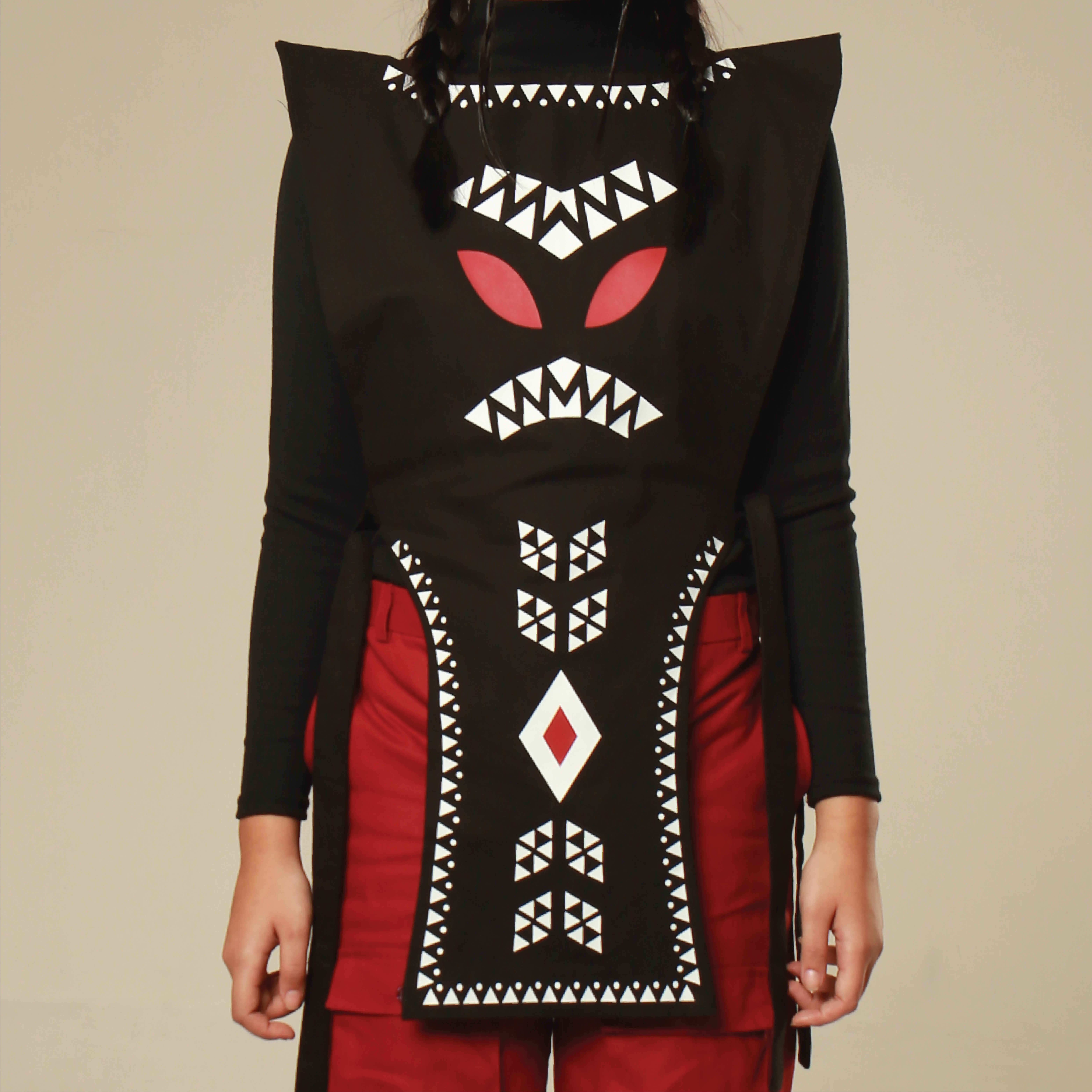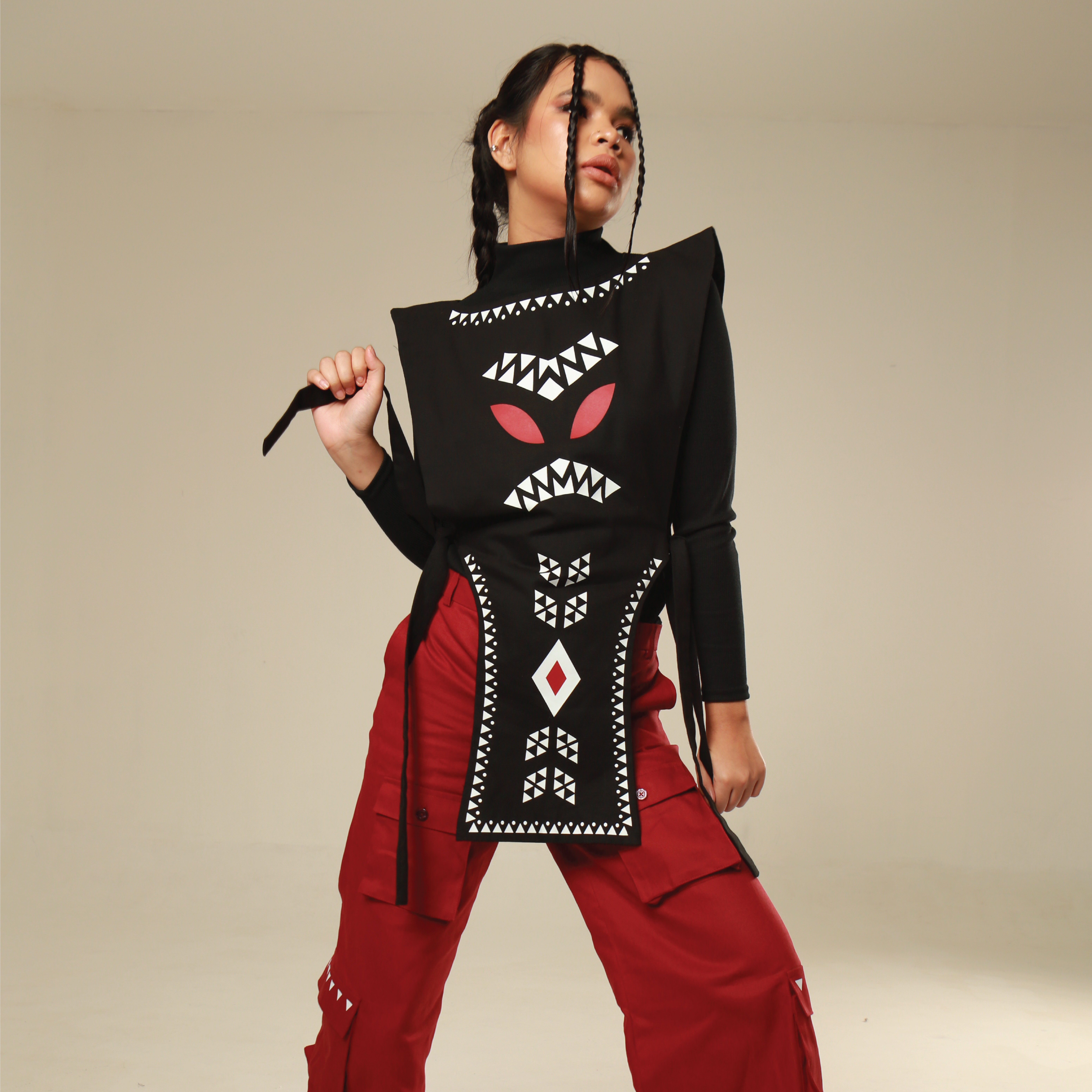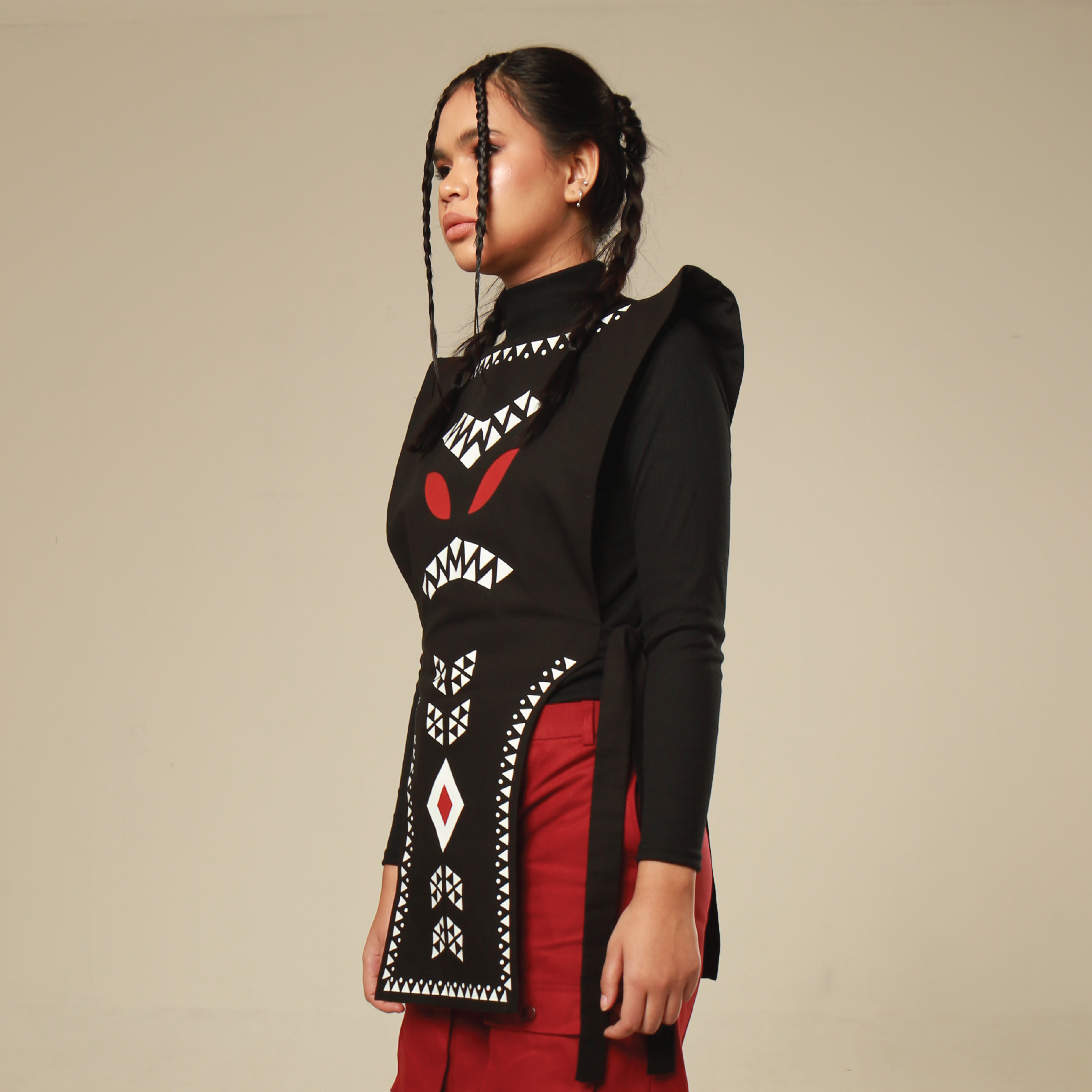 Inspired by the shape and pattern of Salawaku, a traditional weapon from North Maluku, Indonesia that symbolizes protection and courage. Designed with a bold silhouette and geometric details resembling a symbolic face, this vest is crafted from smooth canvas fabric for comfortable wear. The dominant black color combined with red and white accents creates a strong ethnic look.