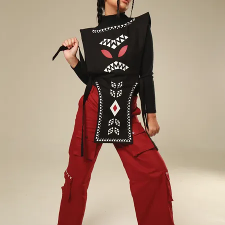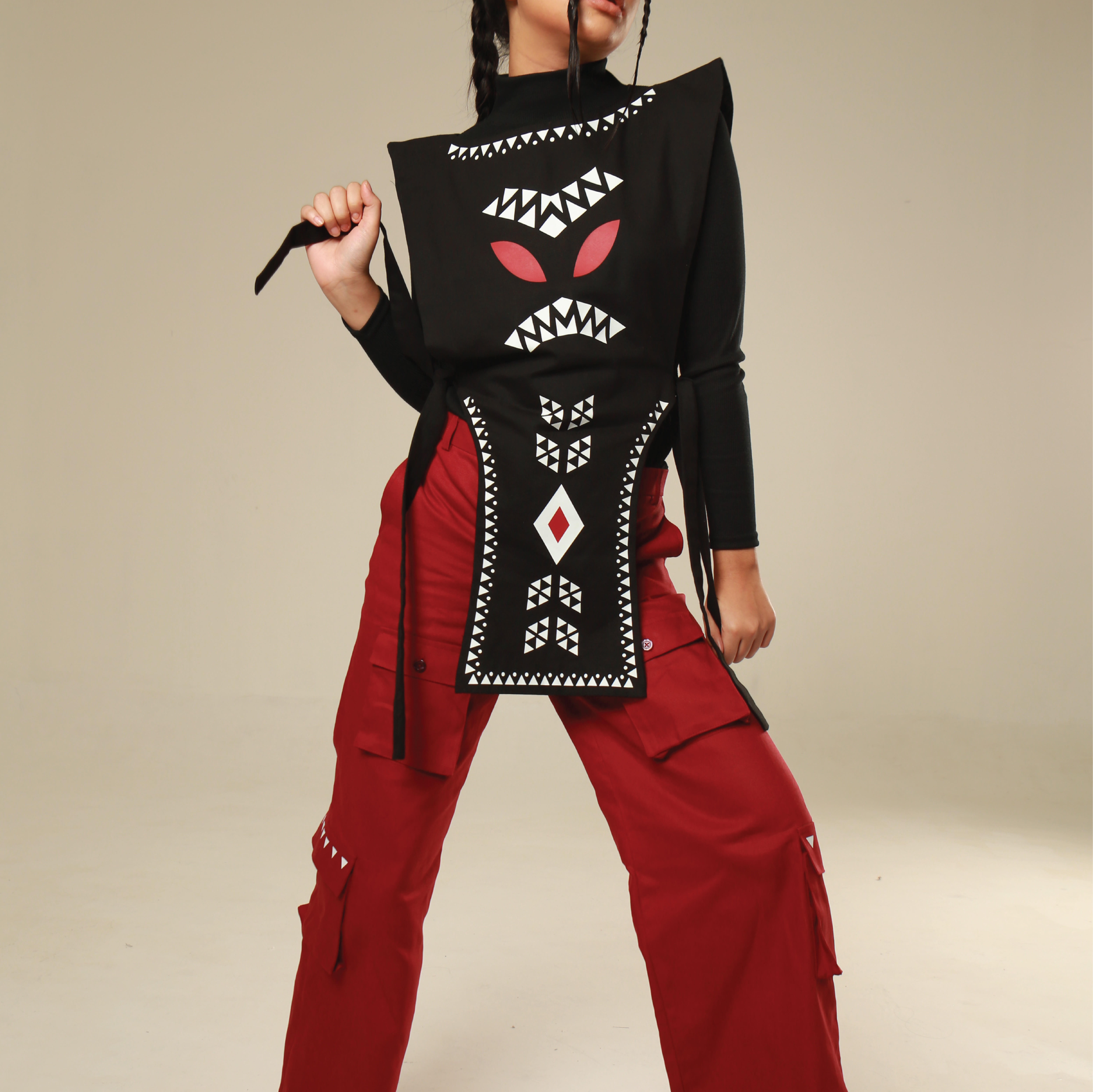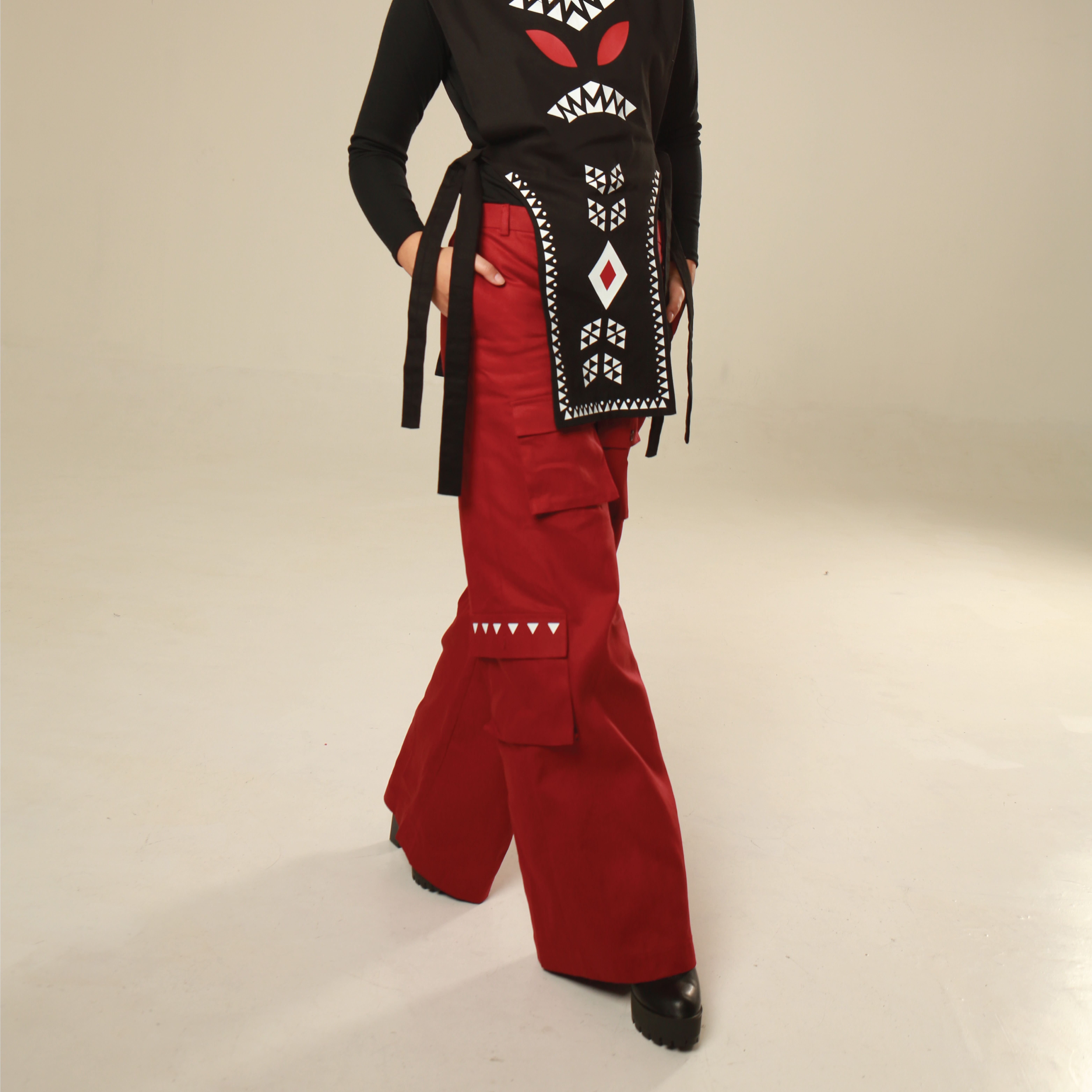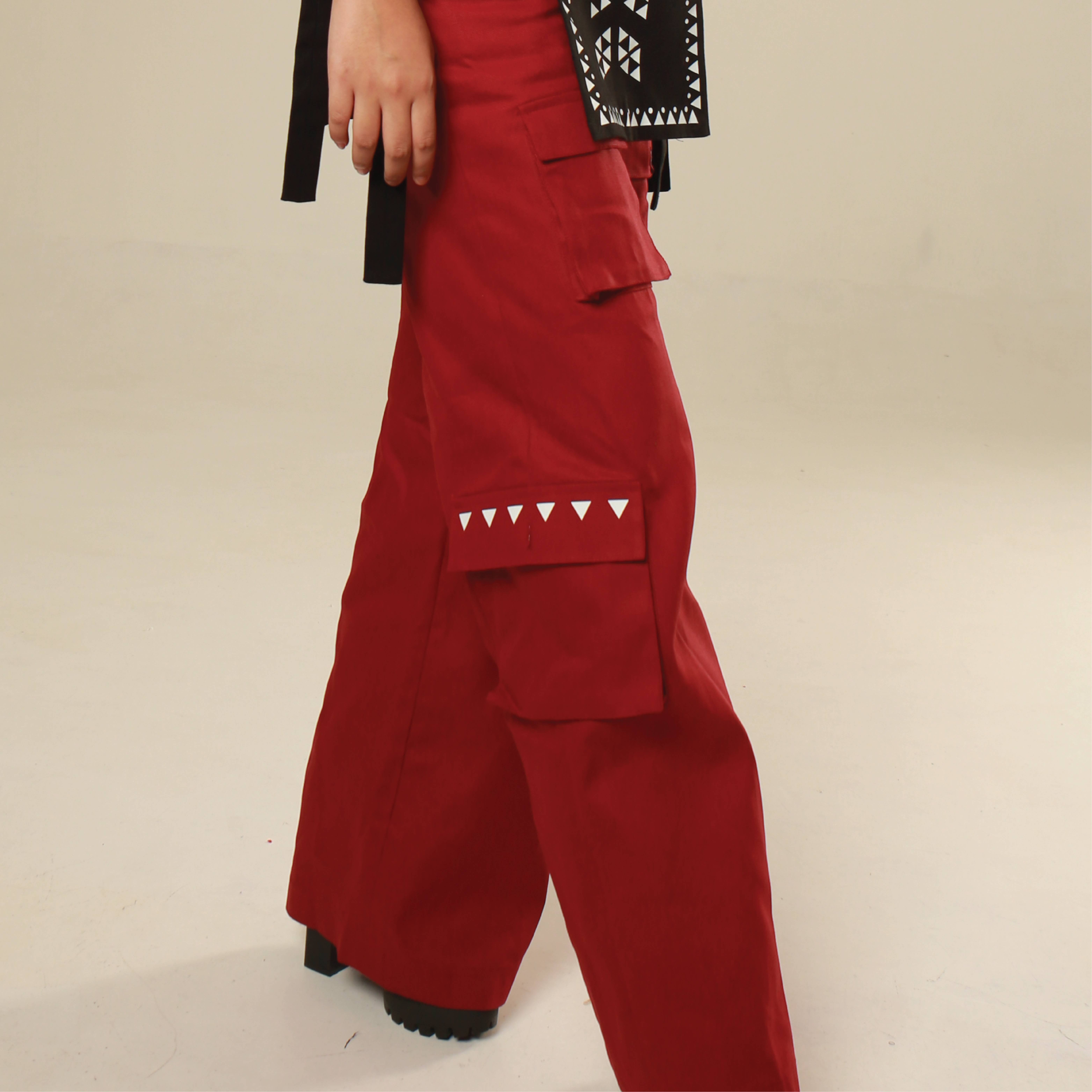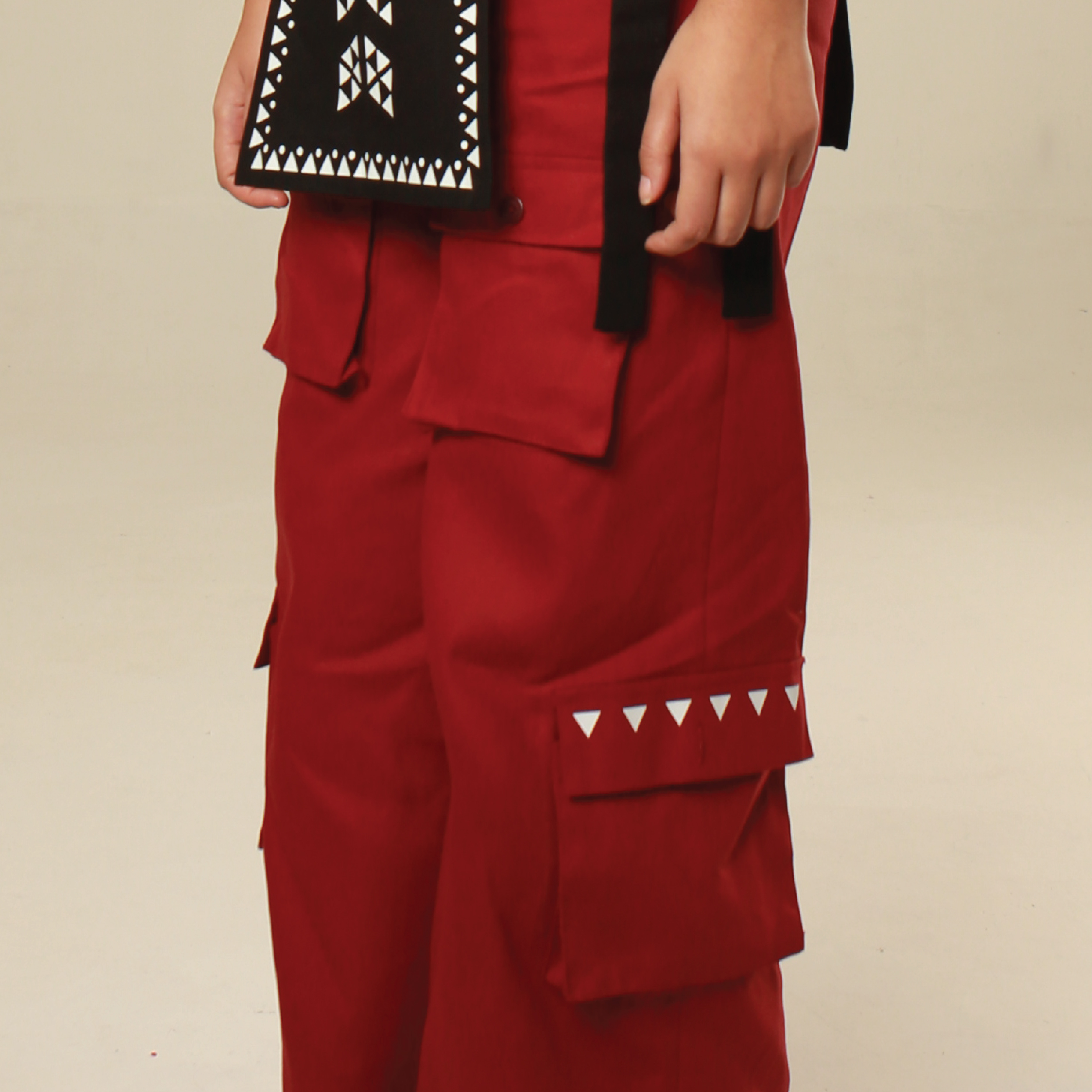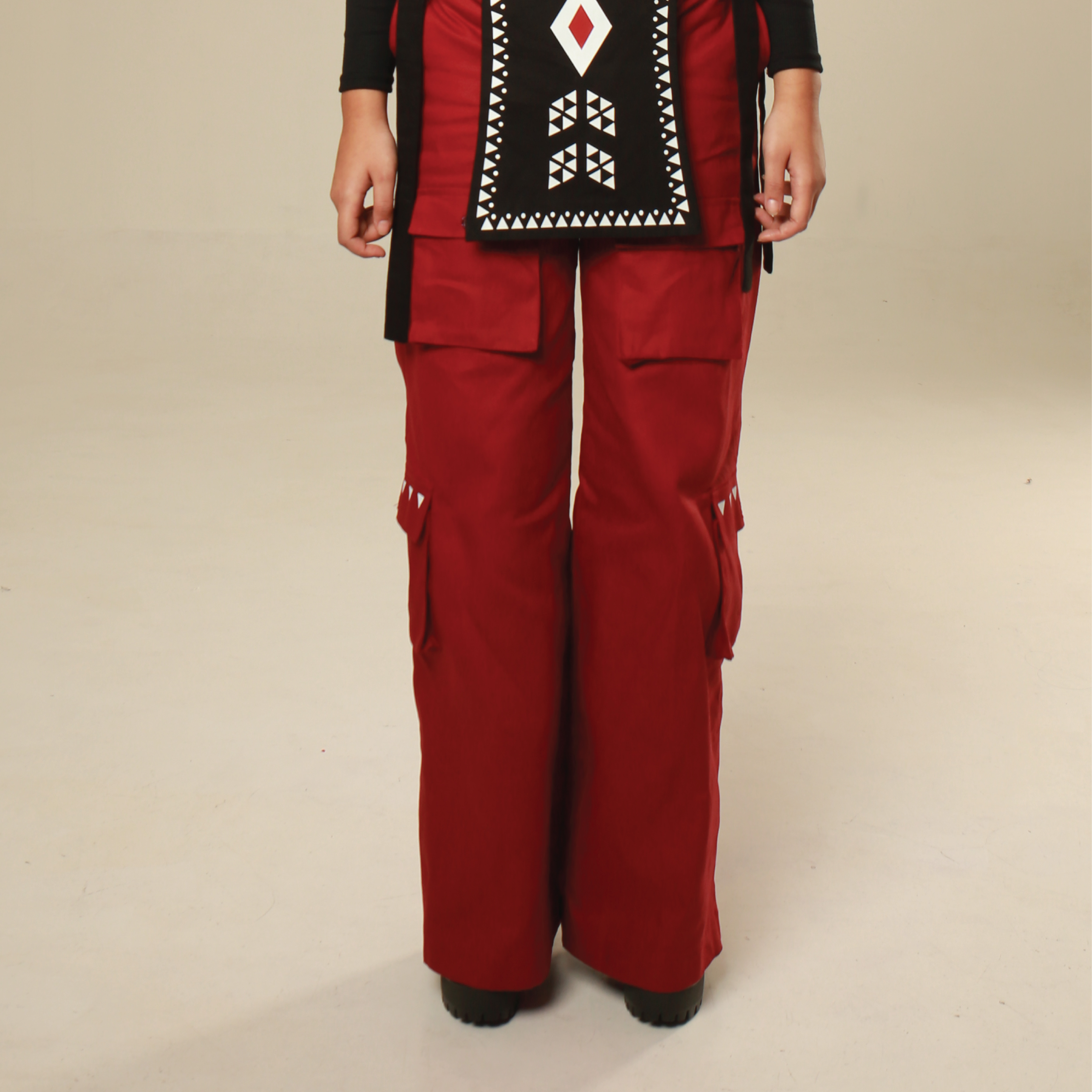 Made from durable yet comfortable maroon canvas. Featuring a wide and structured design, they offer a modern and edgy look, while the geometric pattern detail on the side pocket adds a unique ethnic touch. The loose silhouette allows for freedom of movement, making them perfect for a bold casual look or paired with a statement top for a strong contemporary style.