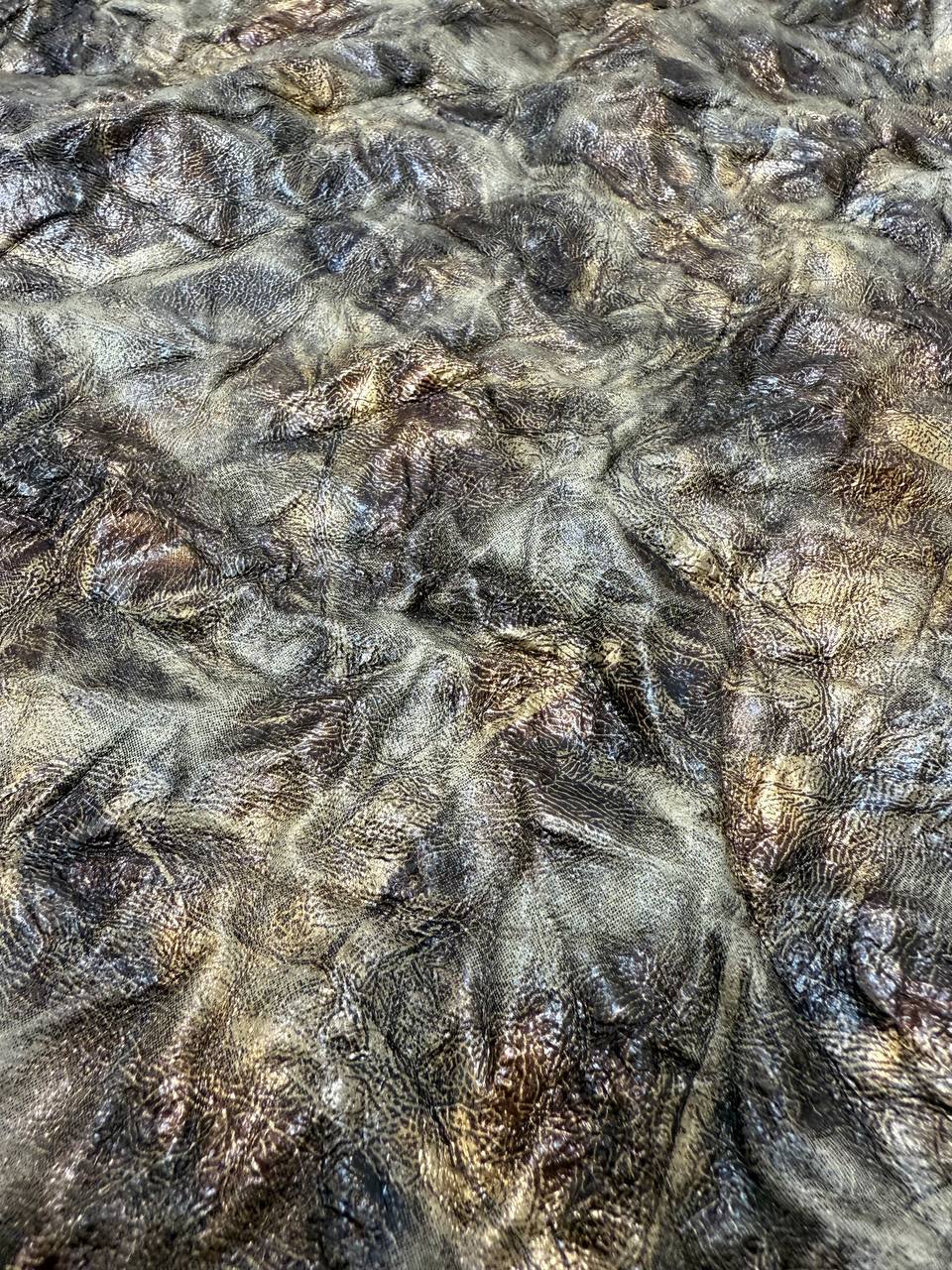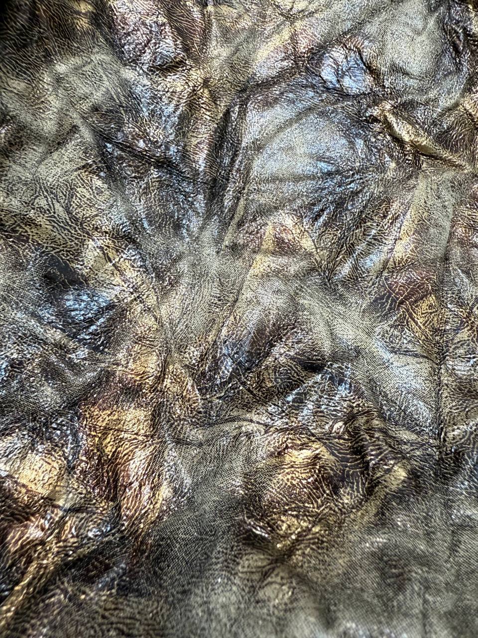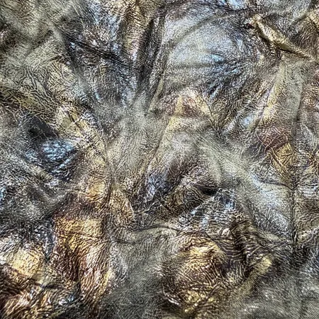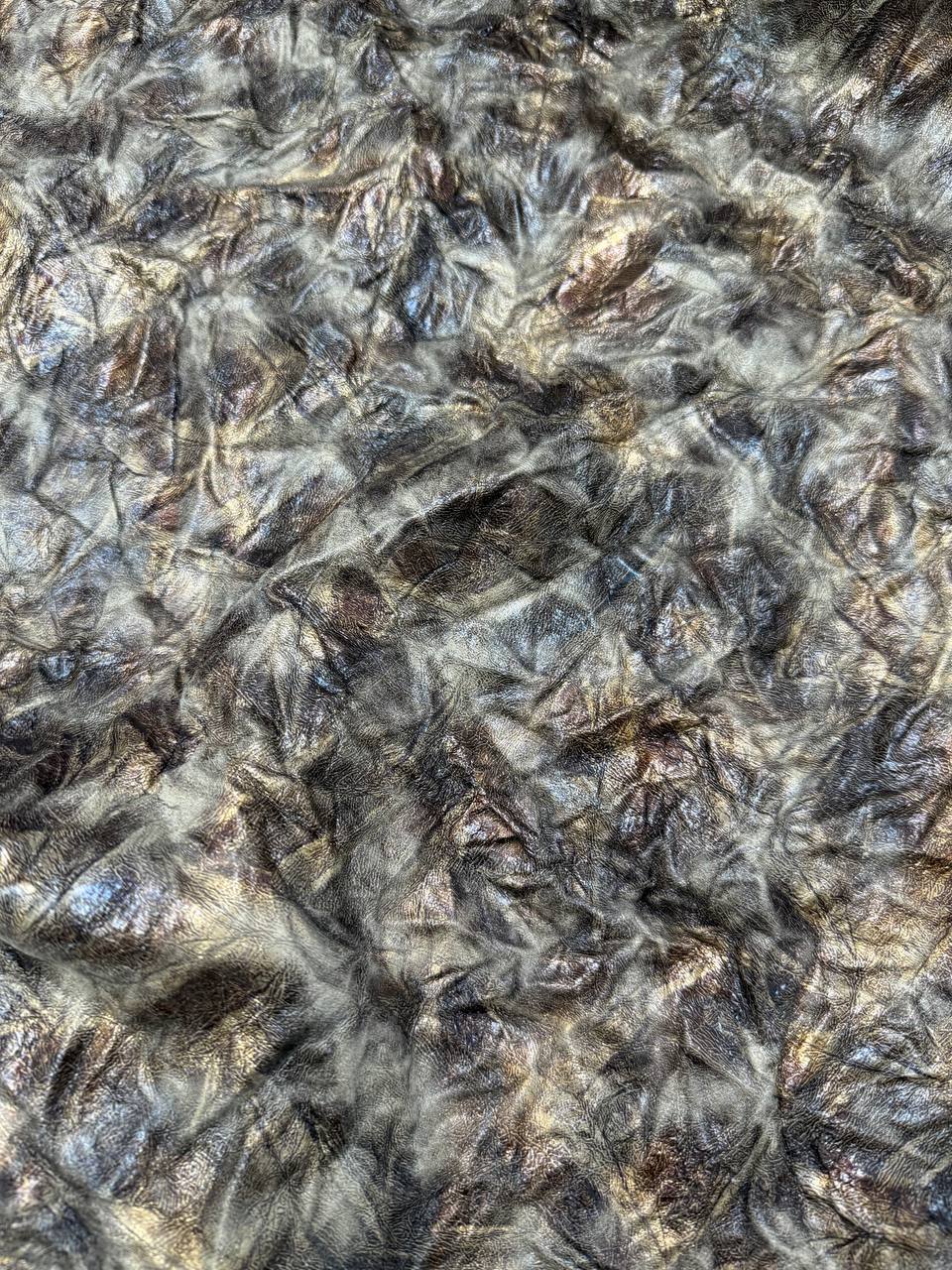 This is a high-quality faux leather that perfectly balances style and comfort. Its soft, tactile surface makes it easy to work with, while ensuring that finished products are comfortable and user-friendly. The crinkled texture adds a dynamic effect, bringing depth and visual interest, while the bronze sheen lends an elegant touch and a subtle metallic glow. Ideal for creating accessories, clothing, footwear, or decorative elements, this material brings a hint of luxury and a modern edge to any design.